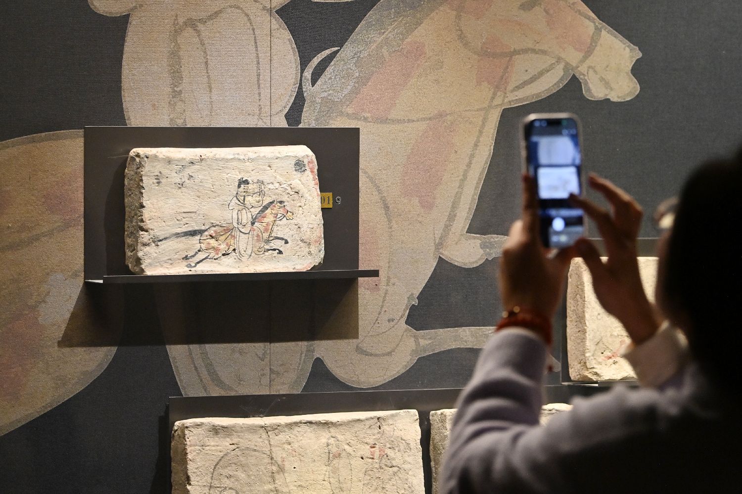 12月24日,在位于兰州的甘肃省博物馆丝绸之路文明展厅内,游客参观魏晋画像砖“邮驿图”。