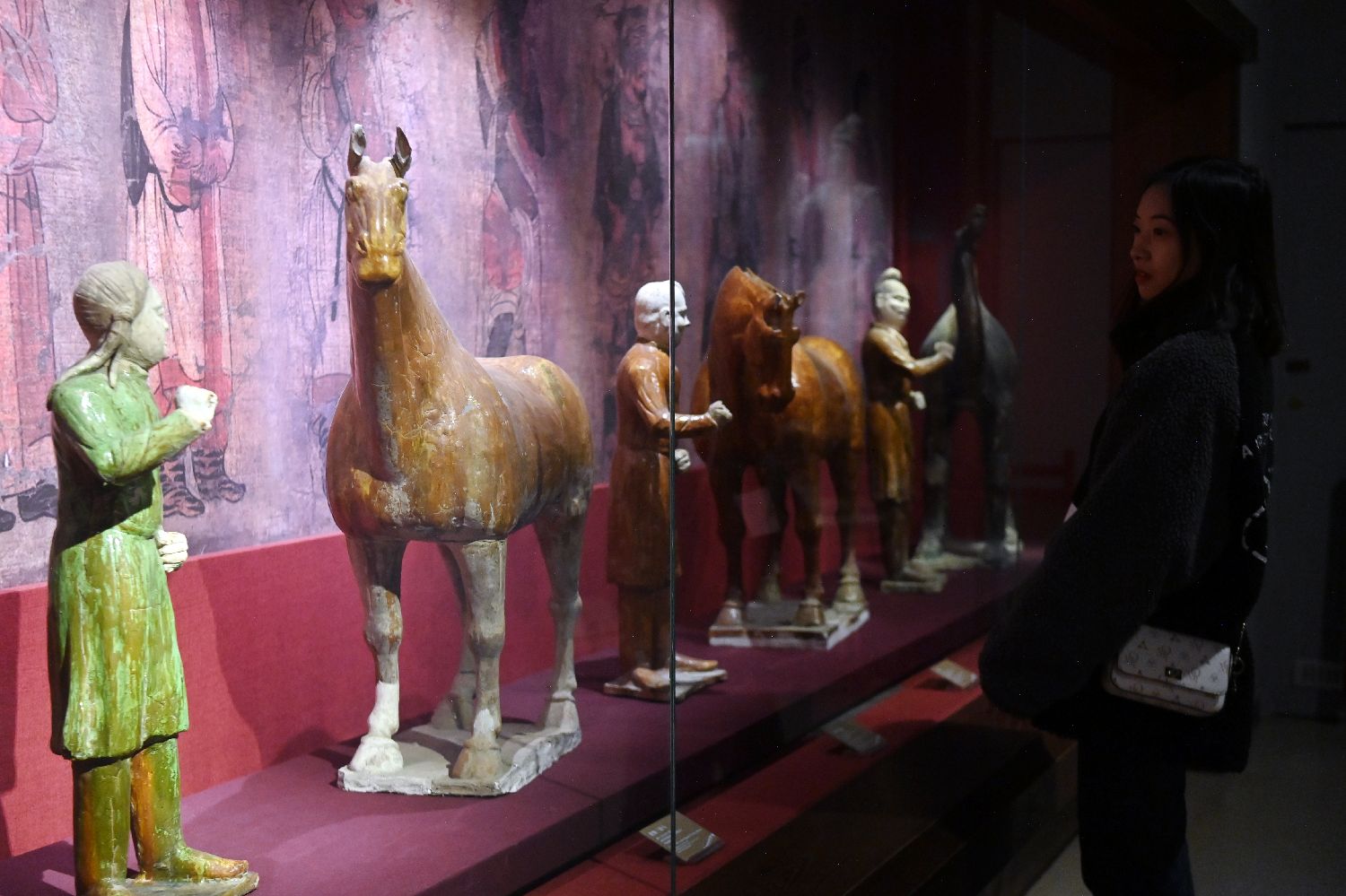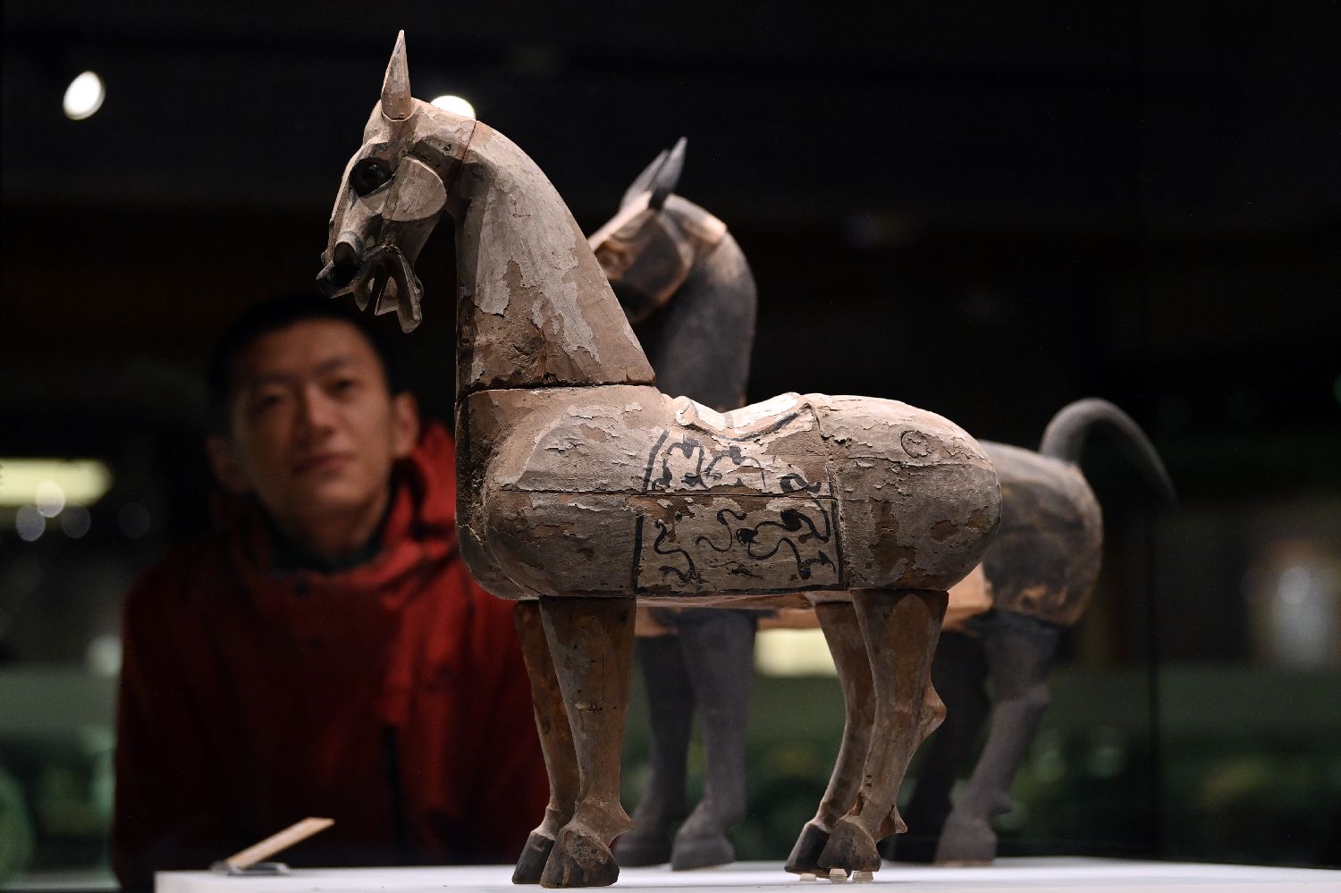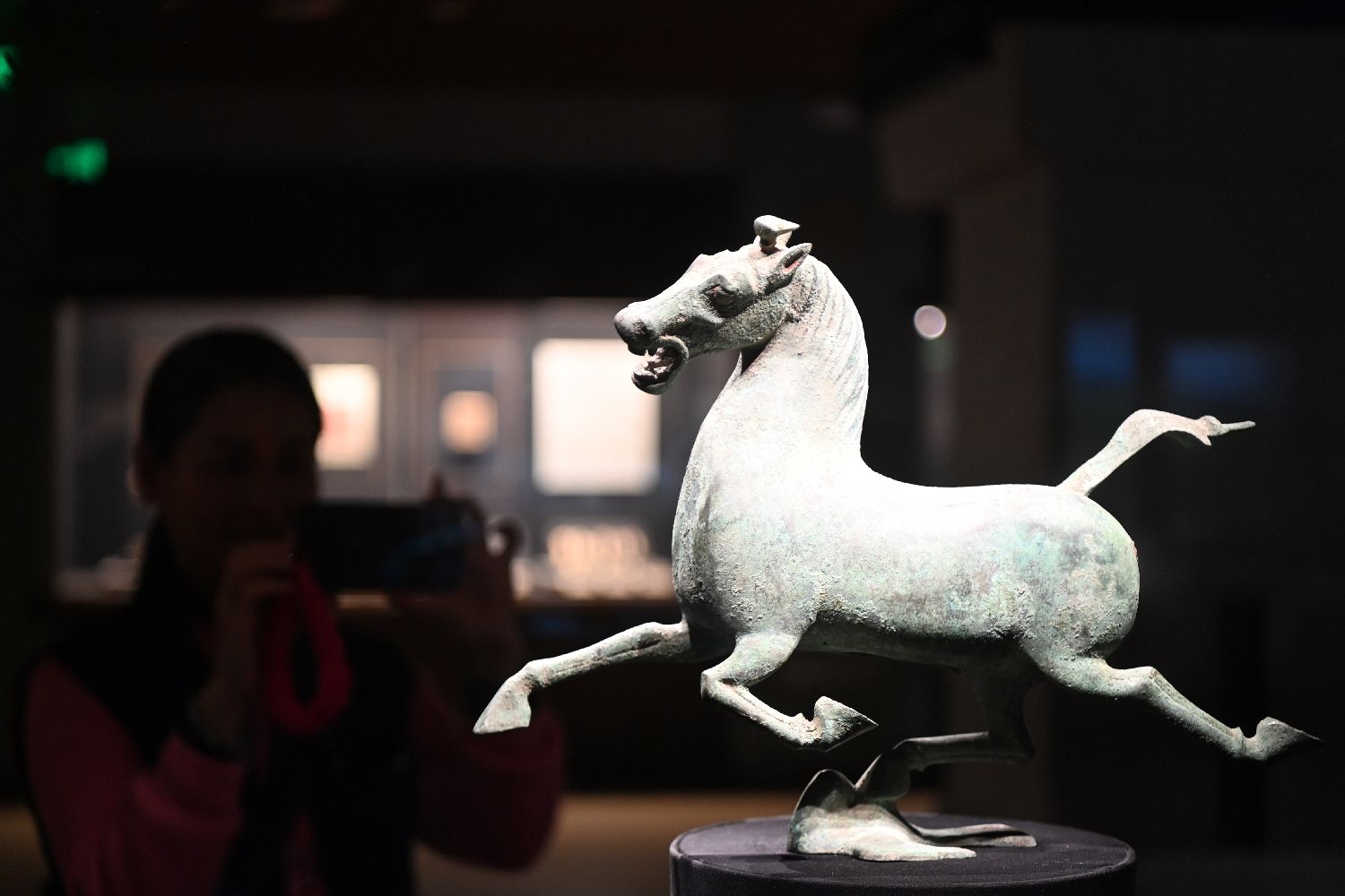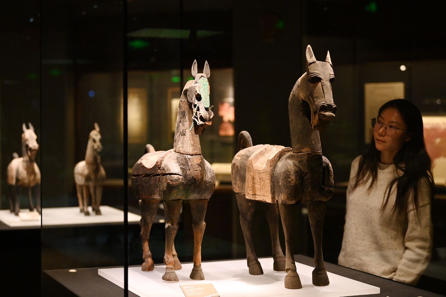 12月24日,在位于兰州的甘肃省博物馆丝绸之路文明展厅内,游客参观汉代墨绘木马。作为中华民族和中华文明的重要发祥地之一,甘肃是古丝绸之路的重要通道,遗留下来诸多以马为主题的珍贵文物,真实再现了丝绸之路上的商贸繁荣与文化交融。