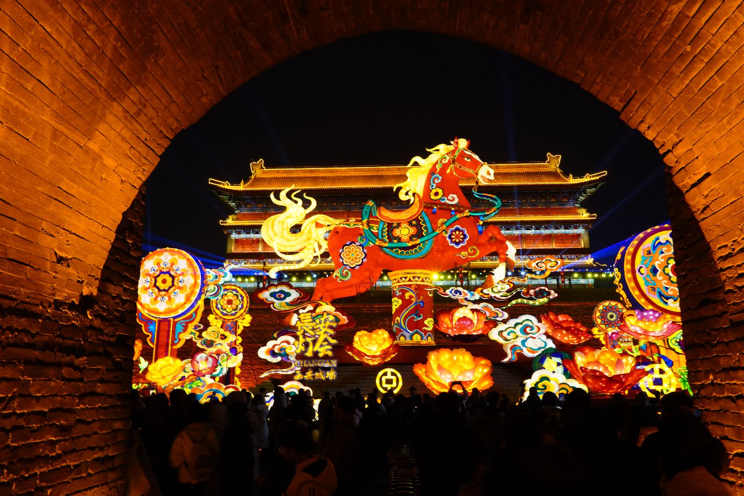 此次活动以“千灯映长安·午马迎春来”为核心主题,围绕“国宝焕新·光耀长安”主线,从“国宝焕新颜、诗韵长安城、奔腾生肖马”三条文化线索展开,活动时间自2026年1月1日持续至3月22日,共计81天。图为2026年西安城墙灯会游人如织。(图片来源:中新网)