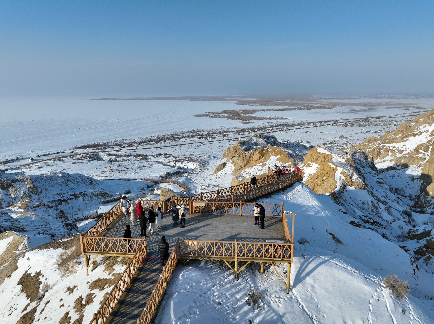 乌伦古湖海上魔鬼城位于中国新疆阿勒泰地区福海县解特阿热勒镇喀拉毕村,魔鬼城拥有雄壮的地质景观,独特的海上雅丹地貌,特有的民俗文化,以及雅丹日出、探宝观景、滑冰玩雪等多样的美景与游乐体验项目。这里被旅行家们称之为“湿地科普宣教馆”“雅丹地质奇观”“有生命的魔鬼城”等。冬季,景区内的冰雪乐园、雪地摩托、冰上漂移、冬钓、VR体验等各种冰雪旅游项目吸引各地游客。图为1月5日,航拍阿勒泰海上魔鬼城。(图片来源:本文图片均来自中新社)