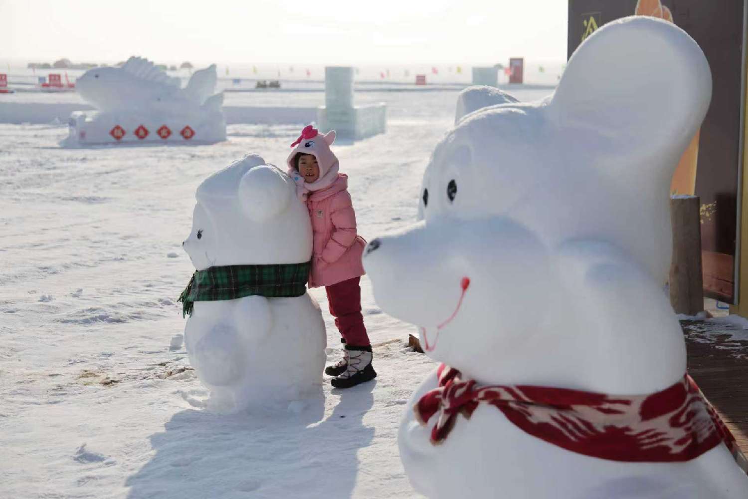 图为1月5日,儿童在阿勒泰海上魔鬼城的雪雕前玩耍。