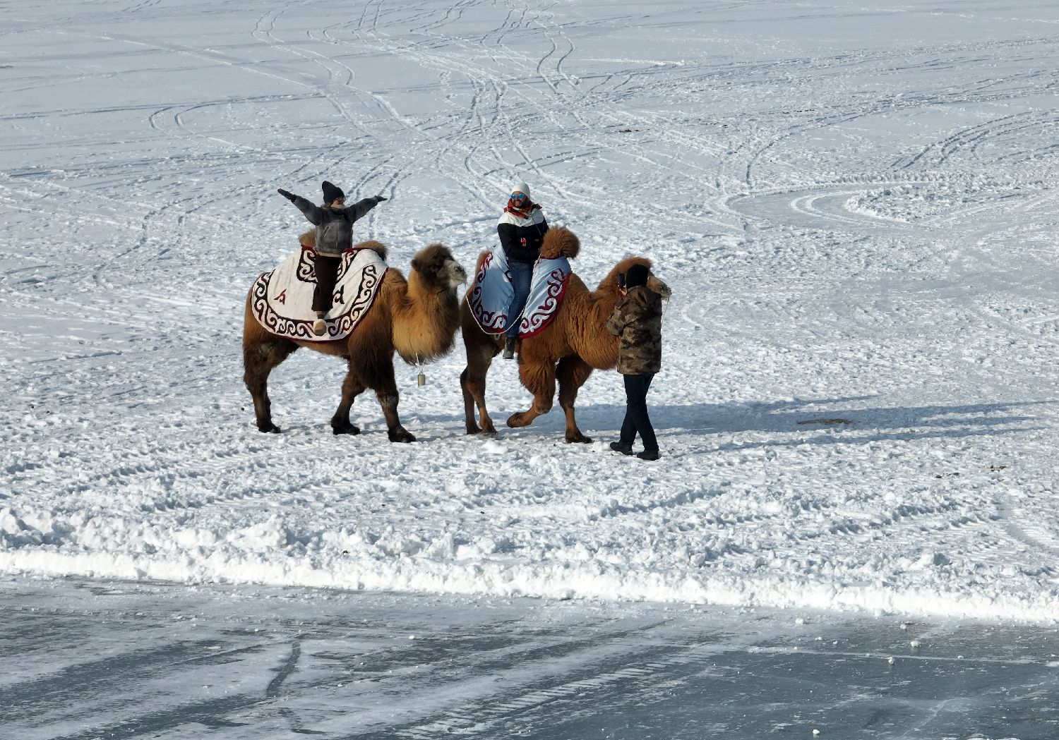 图为1月5日,外国游客在阿勒泰海上魔鬼城骑骆驼。