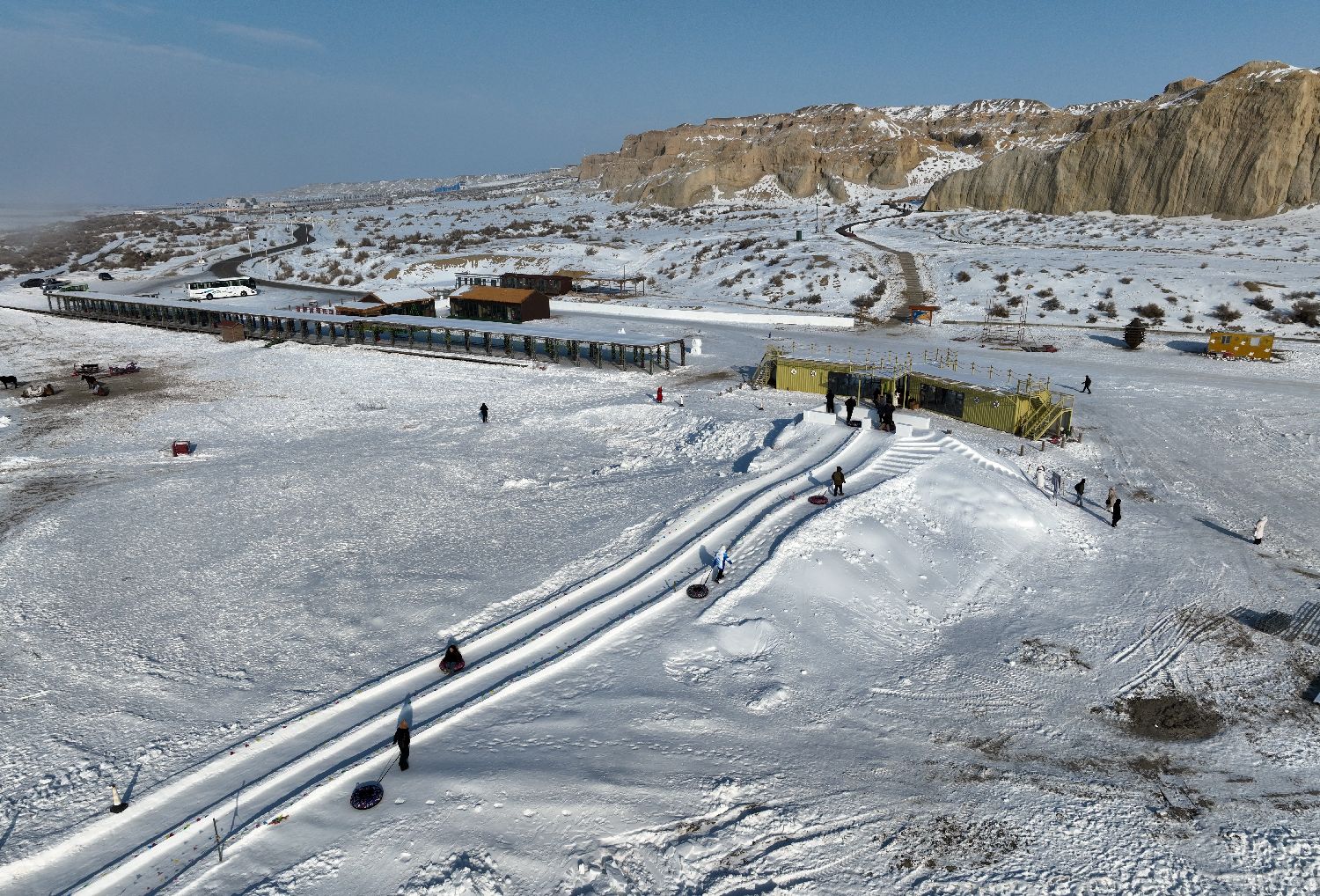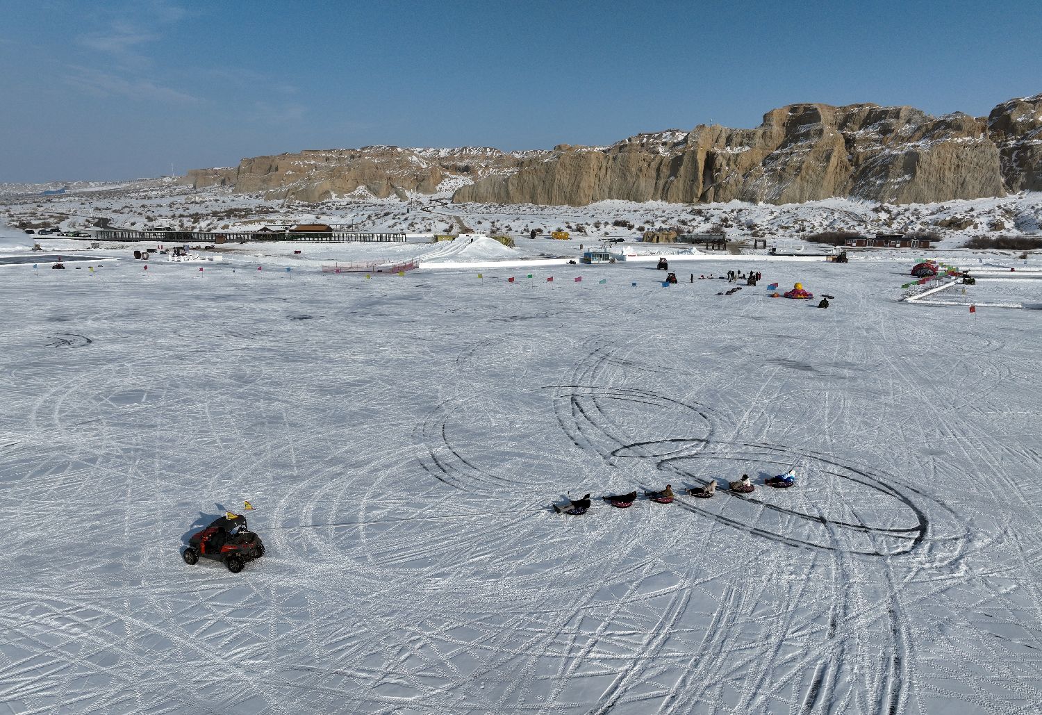 图为1月5日,游客在阿勒泰海上魔鬼城玩雪爬犁。