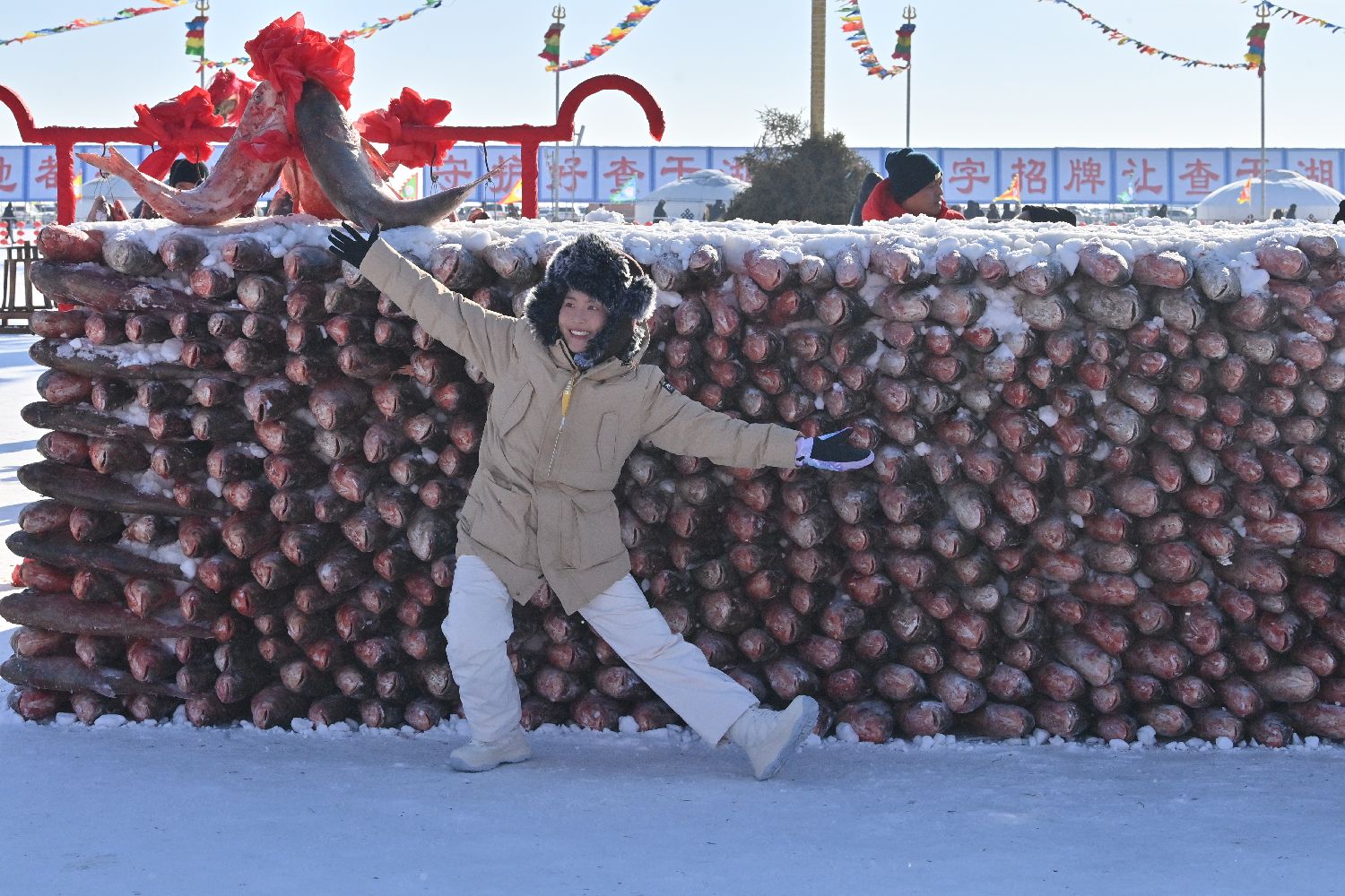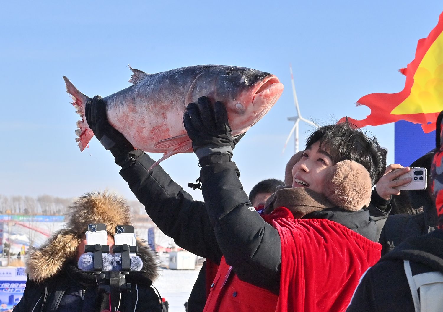 图为在查干湖湖面上举行的“头鱼”拍卖仪式中,“头鱼”拍卖成交价为1699999元人民币。