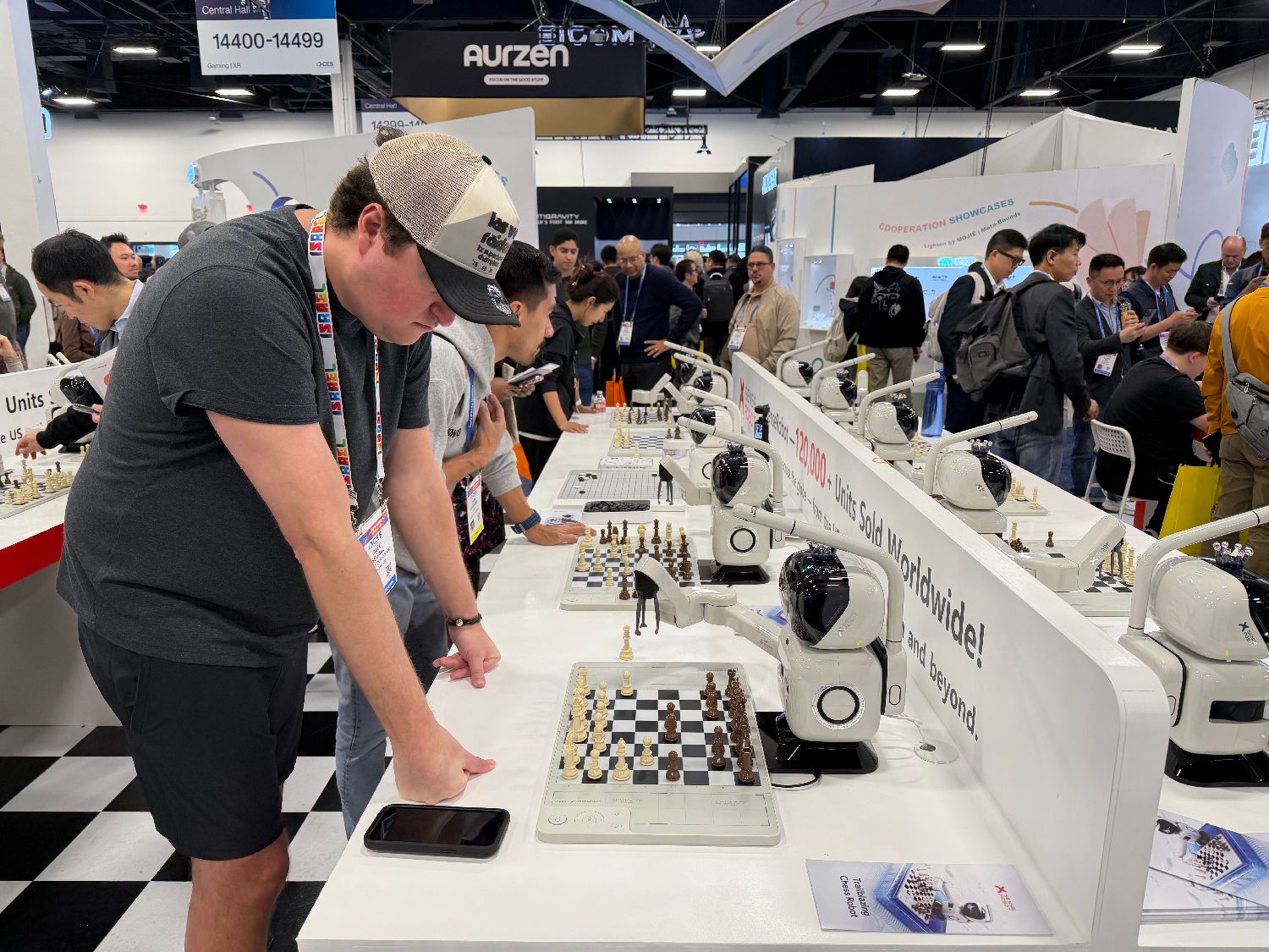 1月7日,2026年美国消费电子展(CES)在内华达州拉斯维加斯继续举行。本届展会聚焦人工智能(AI)和机器人等前沿科技趋势,“炫技”的机器人备受关注。图为参观者与机器人“棋手”对弈。(图片来源:本文图片均来自中新社)