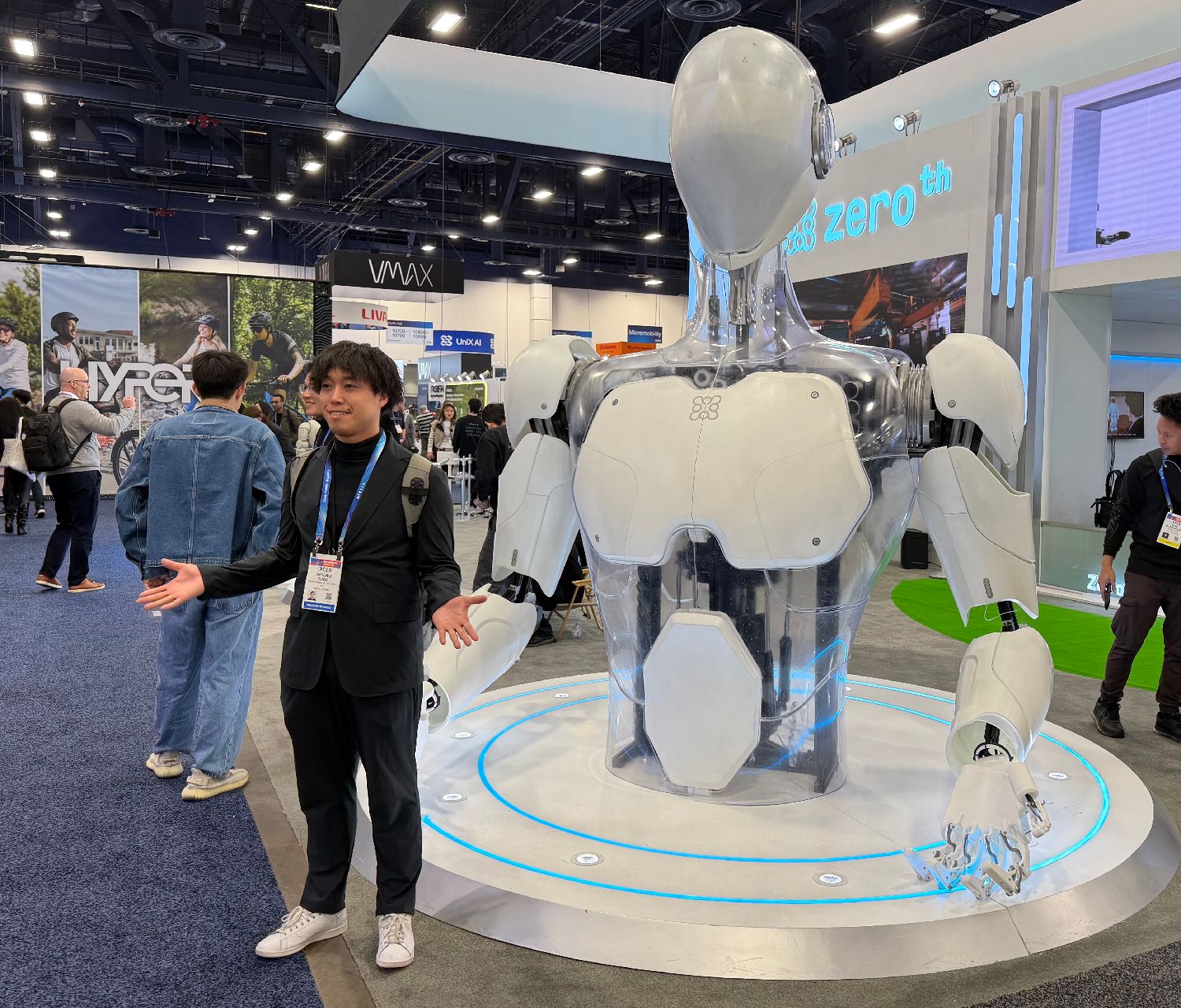 图为中国企业宇树科技展台,“拳击”机器人吸引众多参观者。