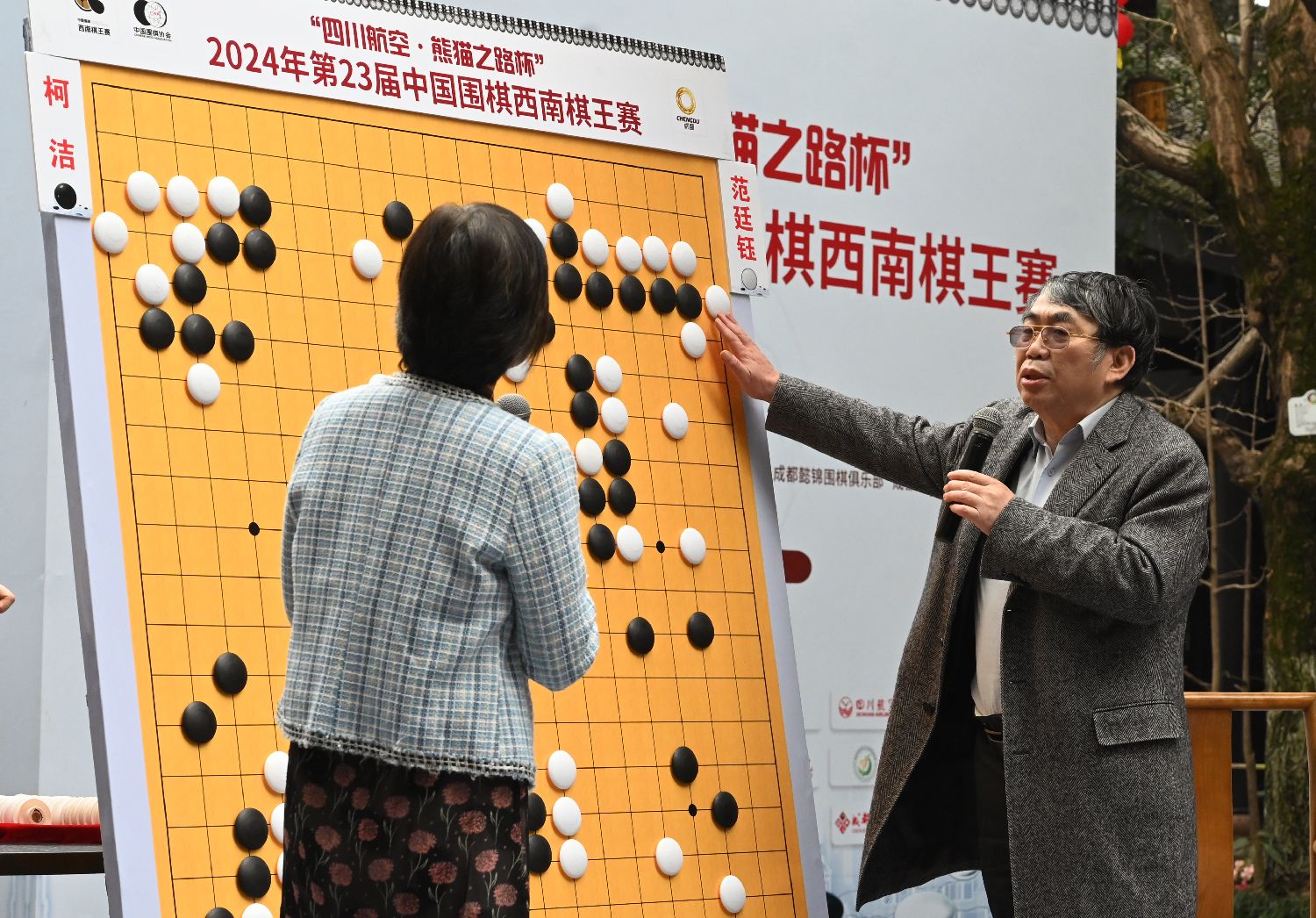 图为2024年3月3日,“四川航空·熊猫之路杯”2024年第23届中国围棋西南棋王赛,聂卫平(右)为棋友们挂盘讲棋。(图片来源:中新社)