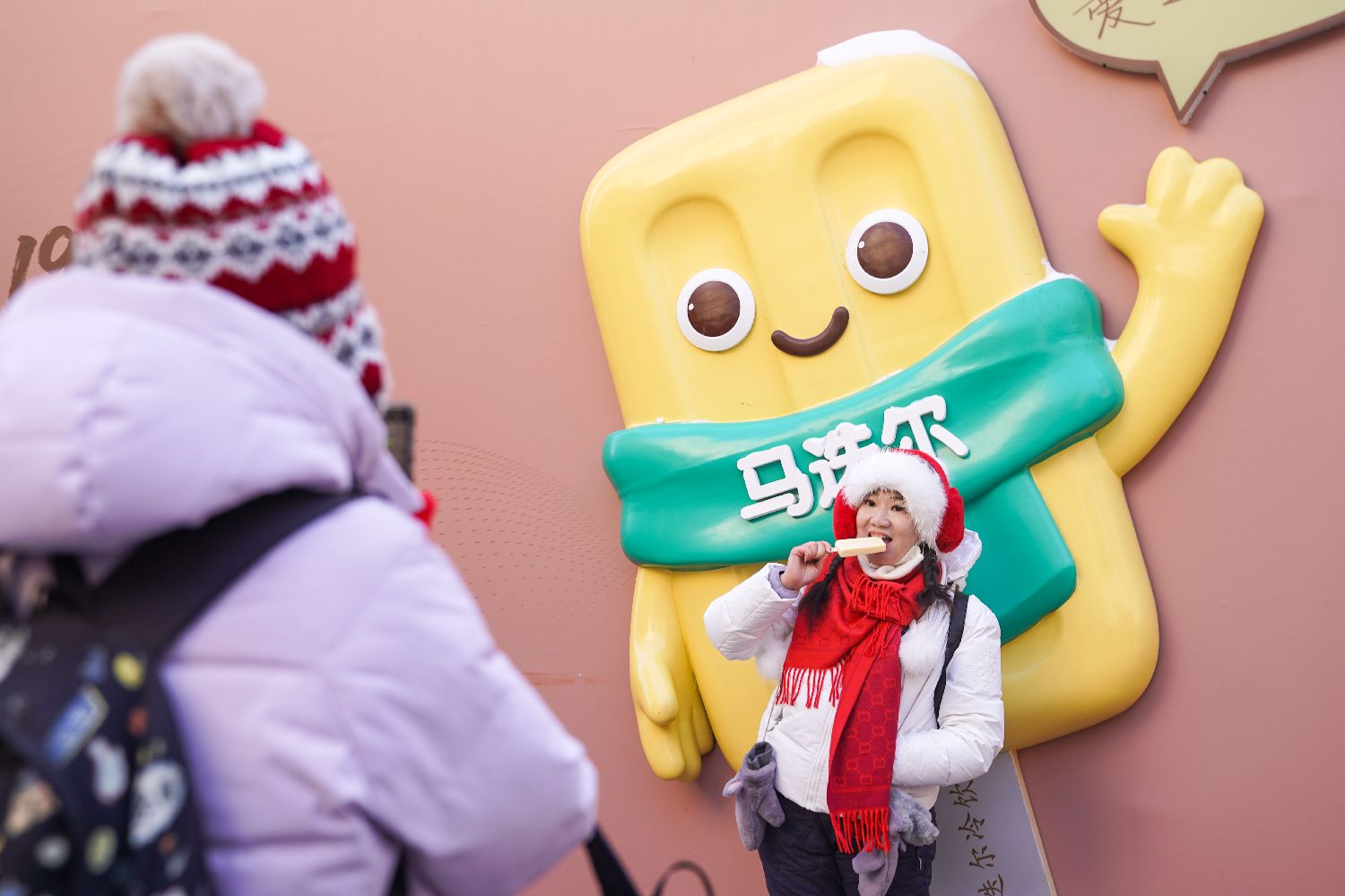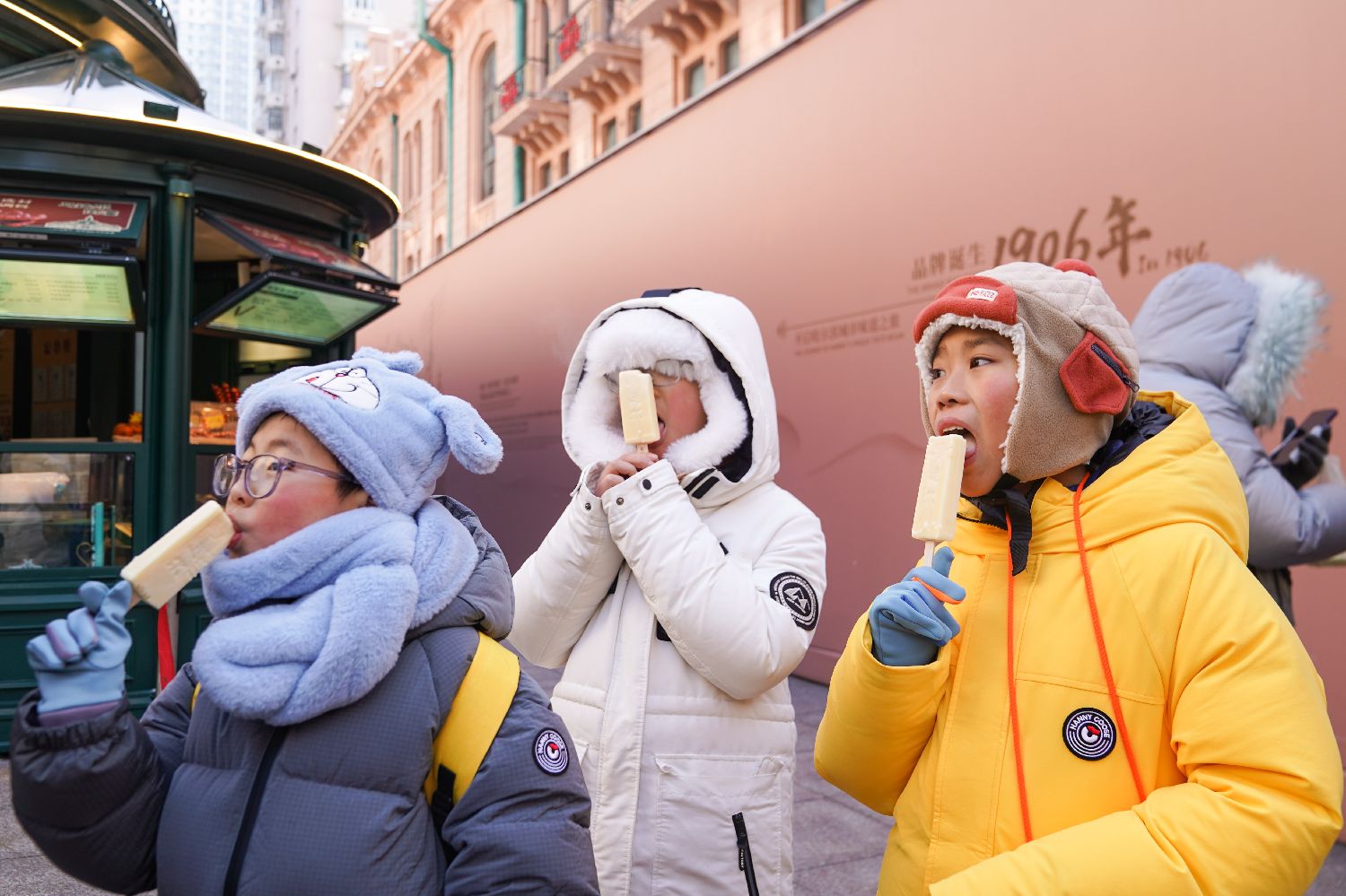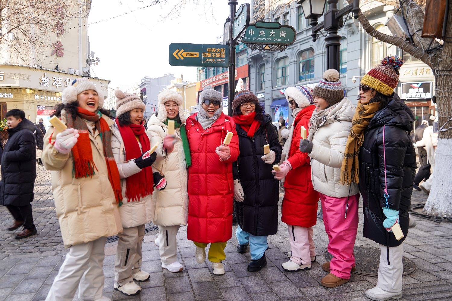 1月15日,在黑龙江哈尔滨中央大街,游客身着厚衣服在寒冷的天气中品尝雪糕,感受“透心凉”的独特体验。(图片来源:中新社)