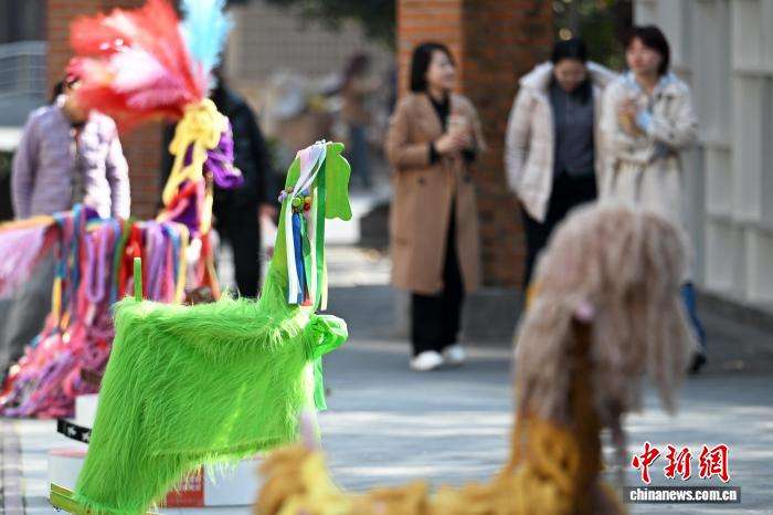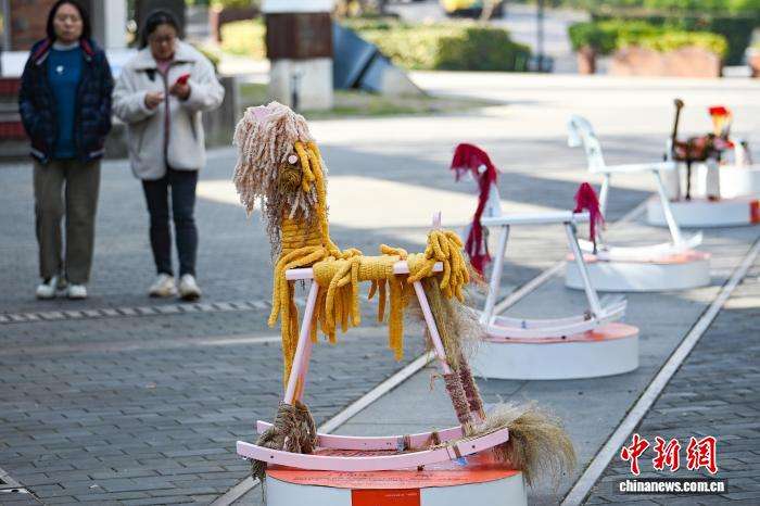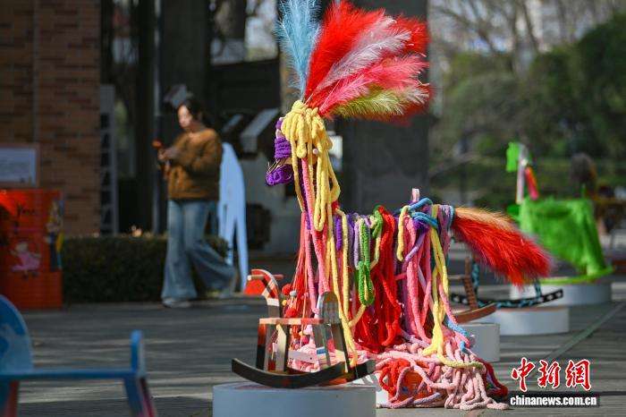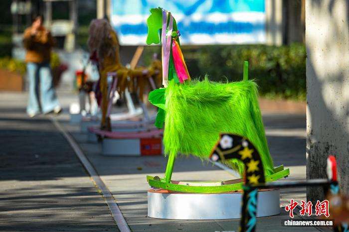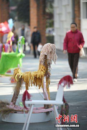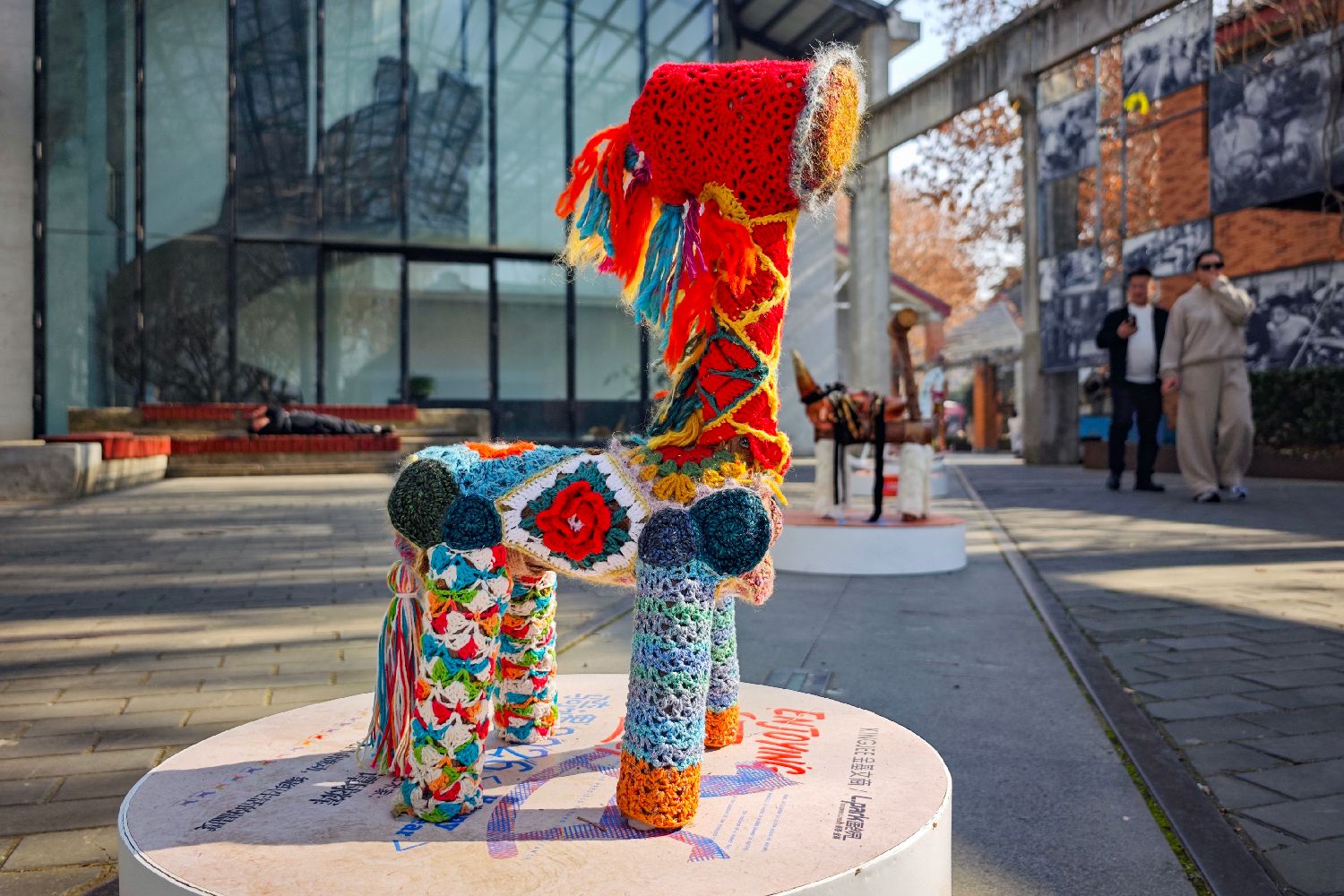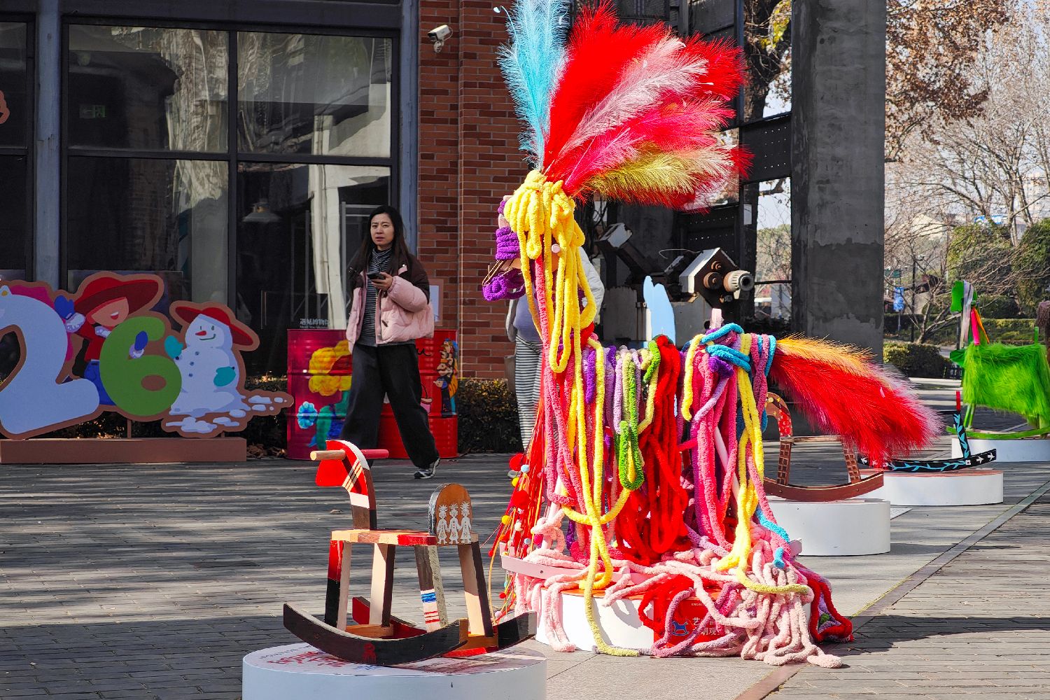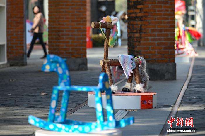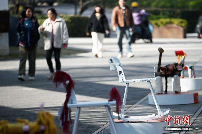 近日,马年主题公共艺术展亮相中国江苏南京街头,多位艺术家以多彩针织、创意装饰等多元形式对木马进行创作。图为1月15日,市民从造型独特的马年主题艺术作品旁走过。(图片来源:中新社)