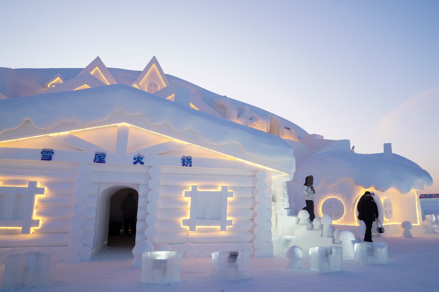 近日,哈尔滨冰雪大世界持续上新,在园区的冰雪温泉营地内,雪屋火锅、雪地温泉、冰屋等吸引游客感受“冰火两重天”的极致体验。图为1月20日,黑龙江哈尔滨,雪屋吸引游客。(图片来源:本文图片均来自中新社)