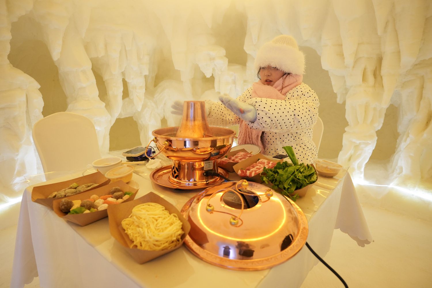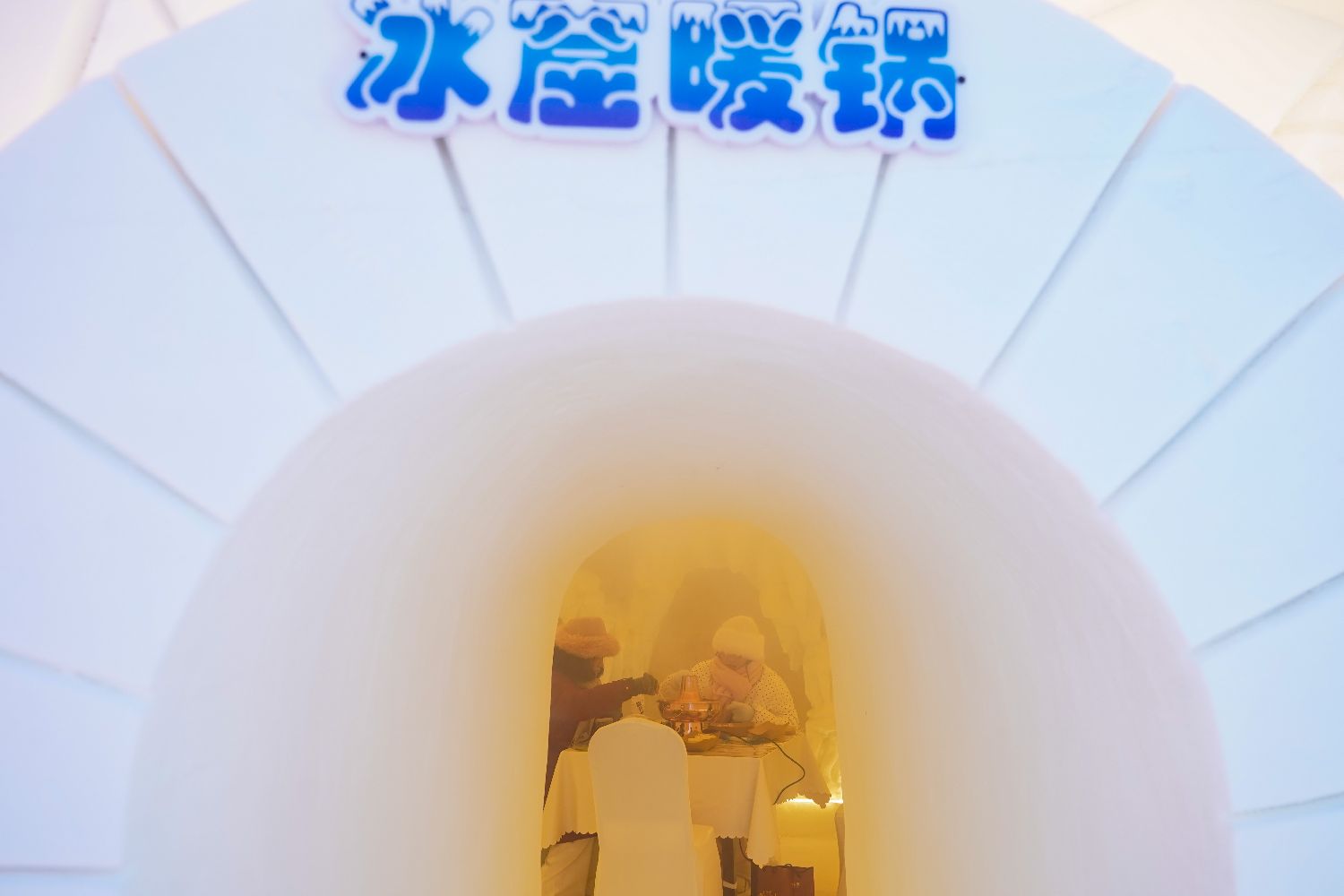 1月20日,黑龙江哈尔滨,游客在雪屋品尝火锅。