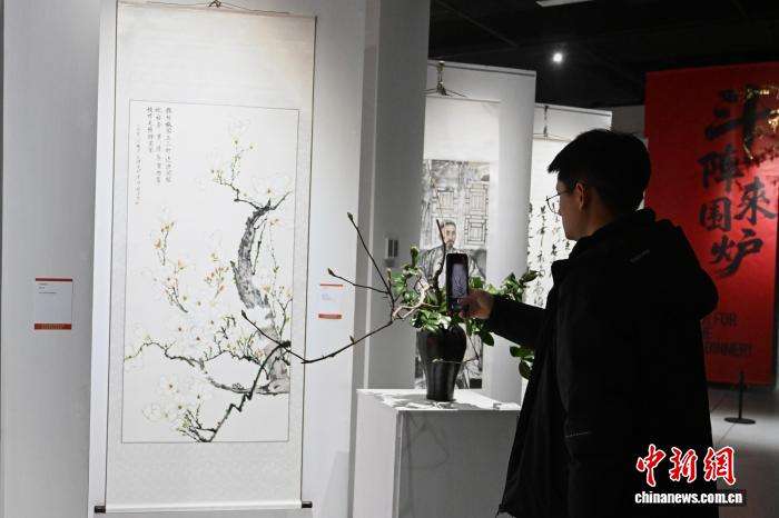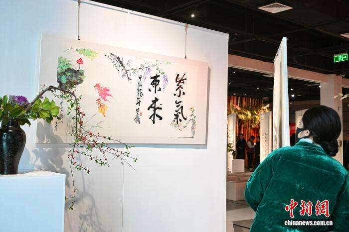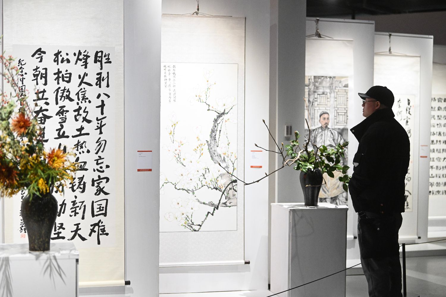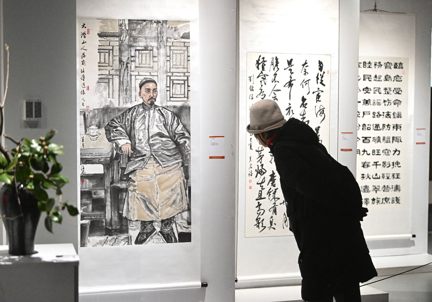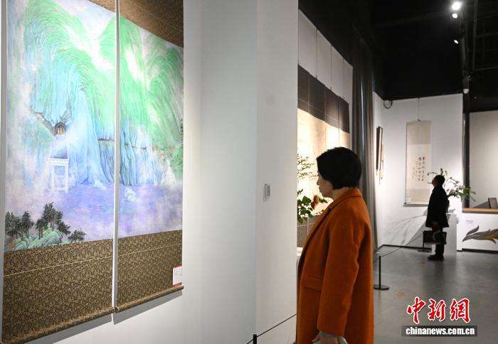 1月28日,“台湾光复80周年纪念展暨两岸跨领域艺术展”在安徽合肥举行。展览通过书画、装置艺术等形式,呈现两岸艺术家在跨领域艺术创作上的探索成果。图为观众在观看展览。(图片来源:中新社)