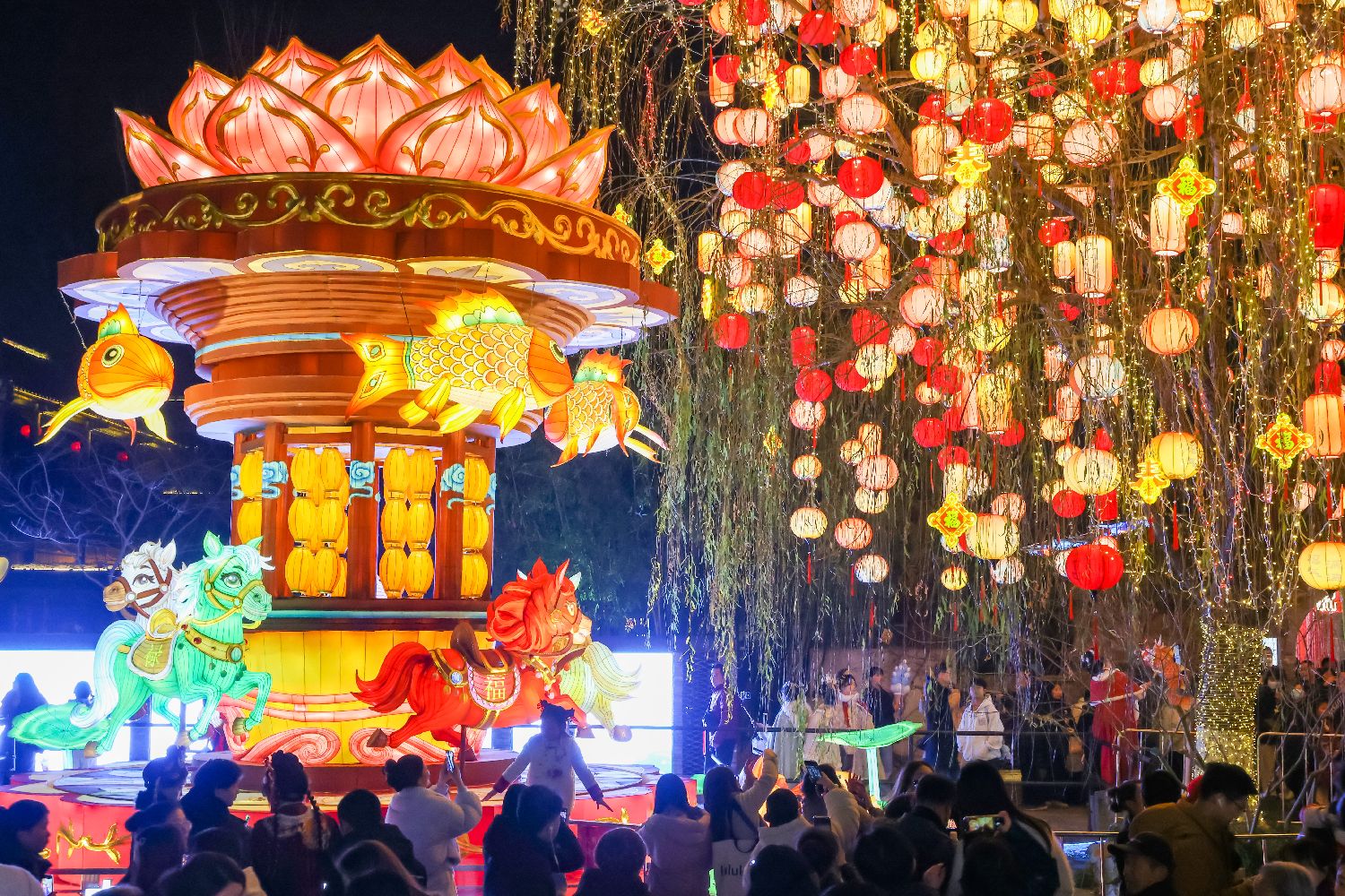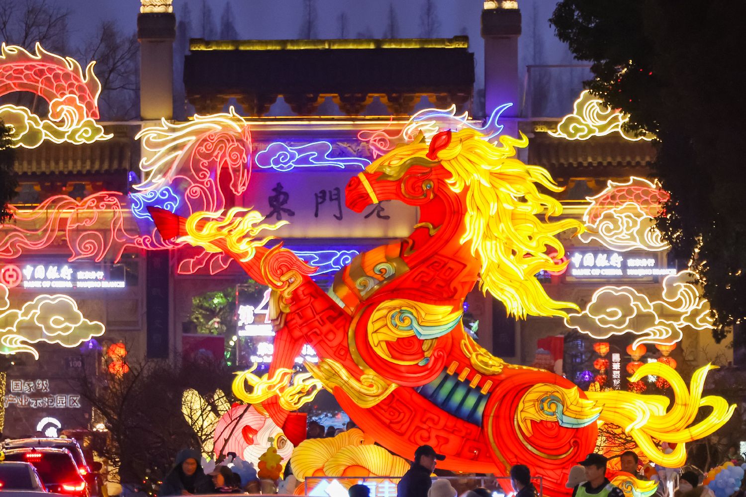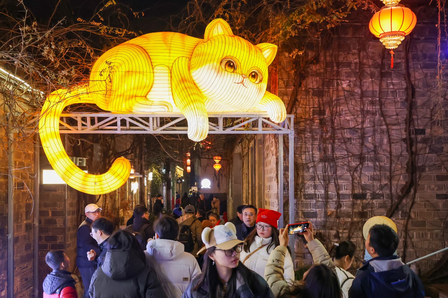 北京时间1月28日晚,江苏南京,市民和游客在城南老街上游玩。春节临近,南京城南街头巷尾安装的大型灯组、各式彩灯陆续亮灯,节日氛围渐浓。(图片来源:本文图片均来自中新社)