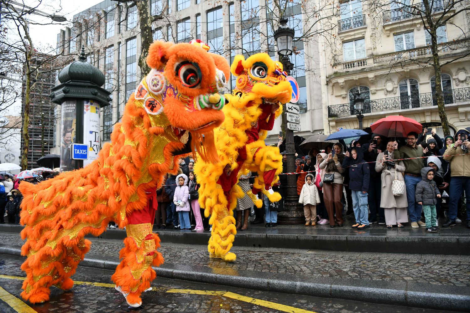 2月1日,法国巴黎香榭丽舍大街新春舞狮活动举行,迎接马年春节,向当地民众送上新春祝福。图为活动现场。(图片来源:本文图片均来自中新社)