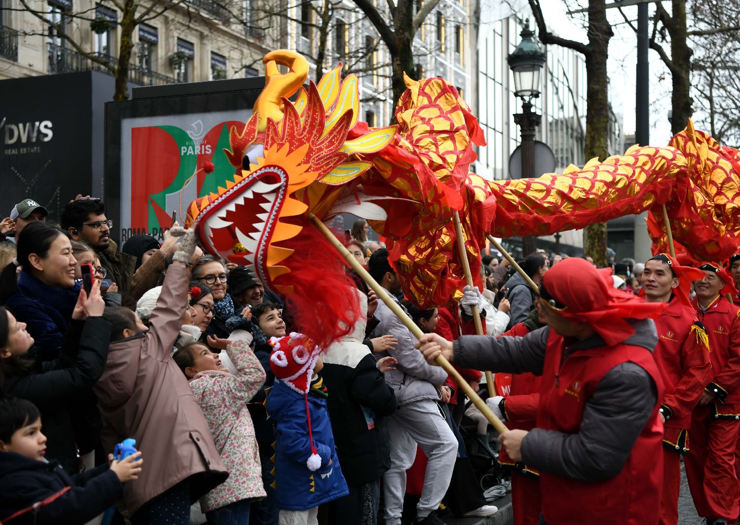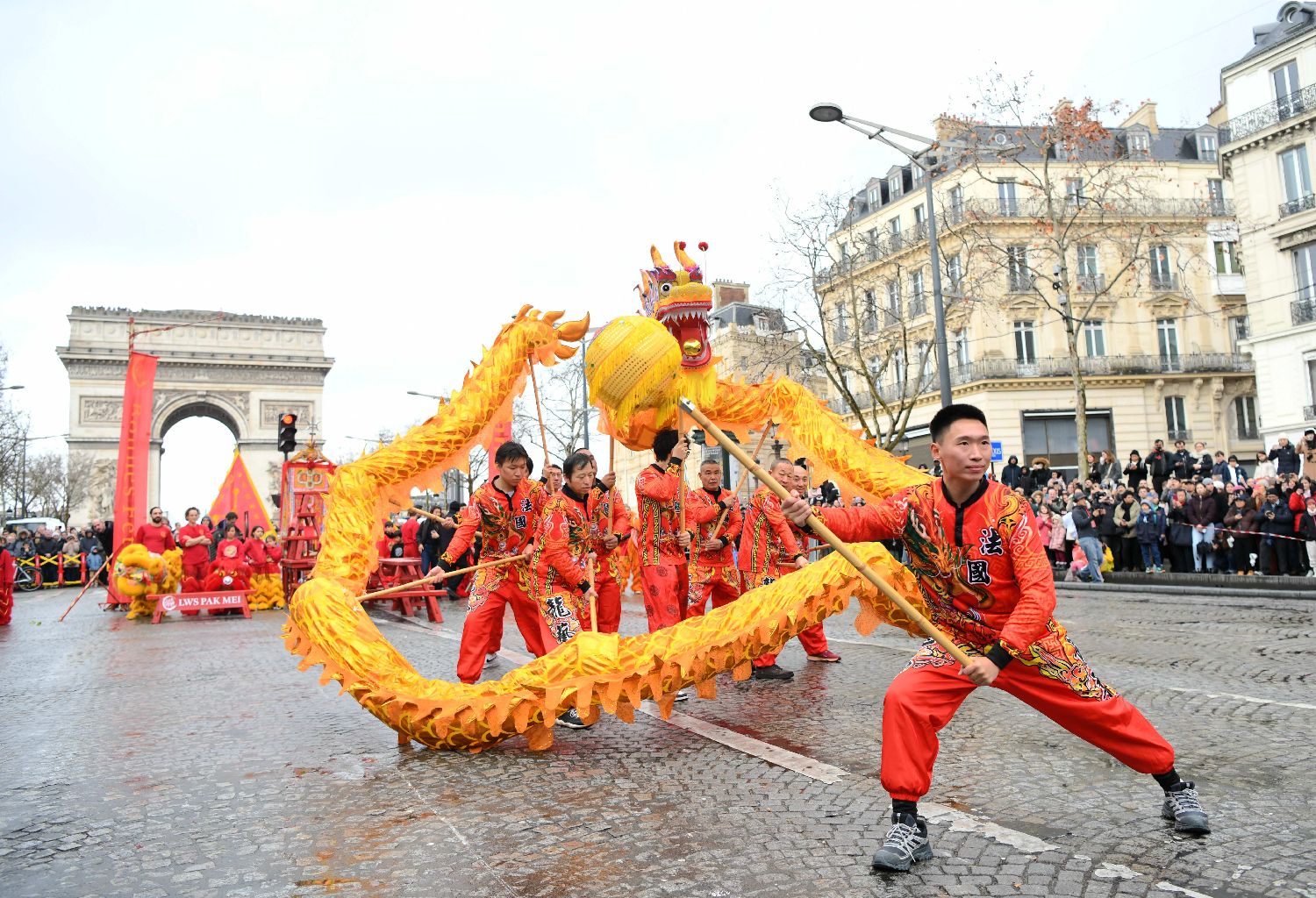 图为法国巴黎香榭丽舍大街新春舞龙活动。