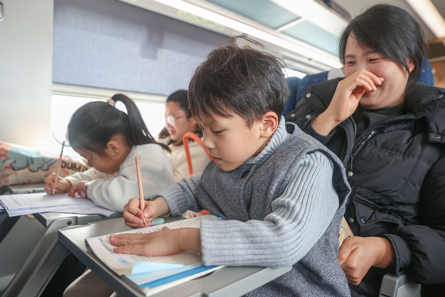 2月2日,在江西井冈山开往江西南昌的C194列车上,两名小朋友在乘车途中写寒假作业。