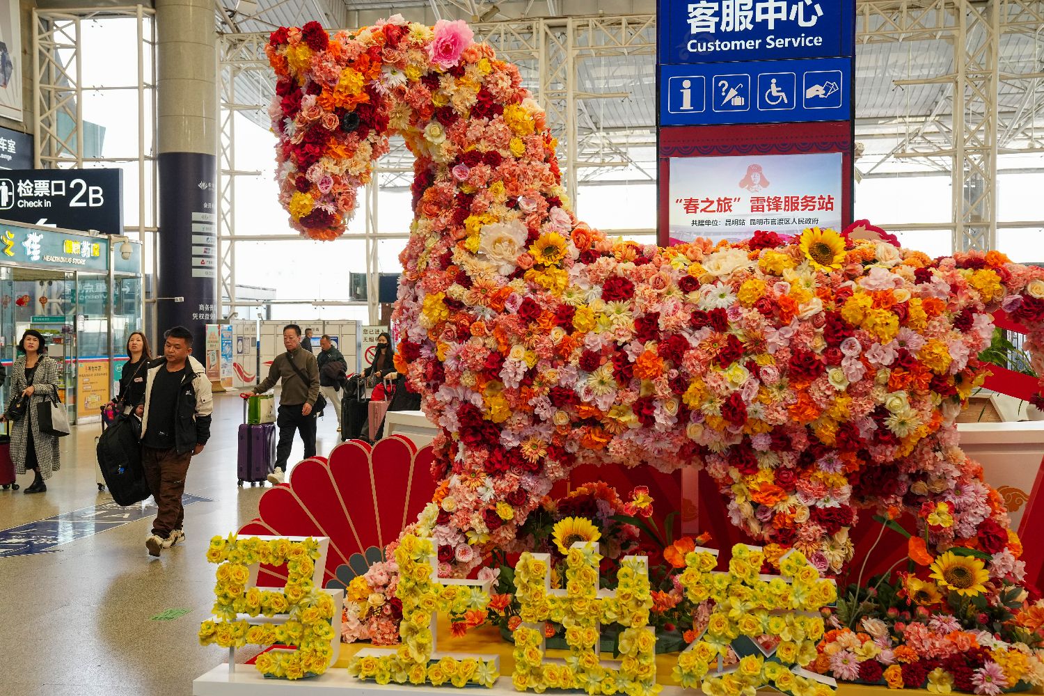 2月2日,云南昆明,昆明站候车大厅里搭建的马年艺术装置。