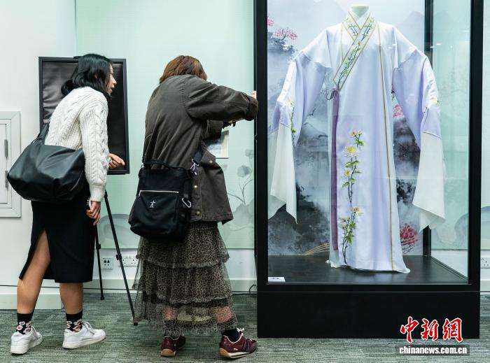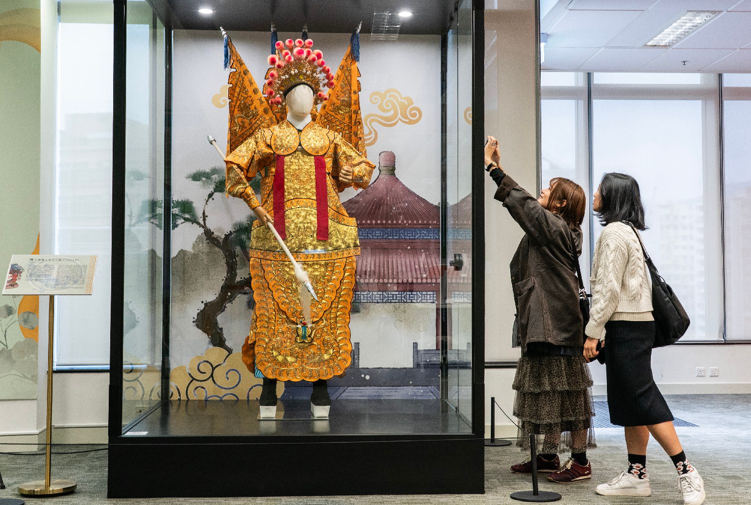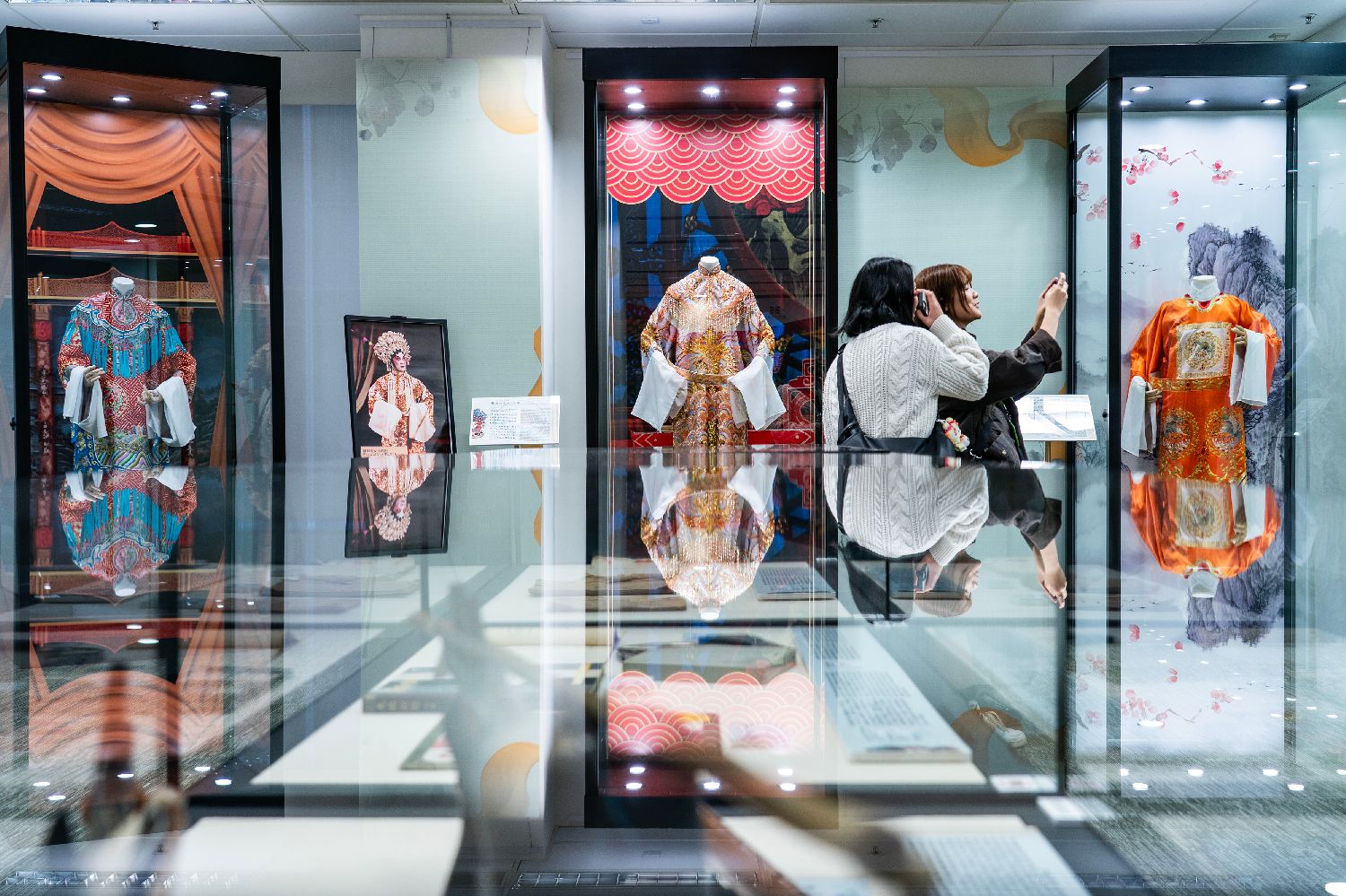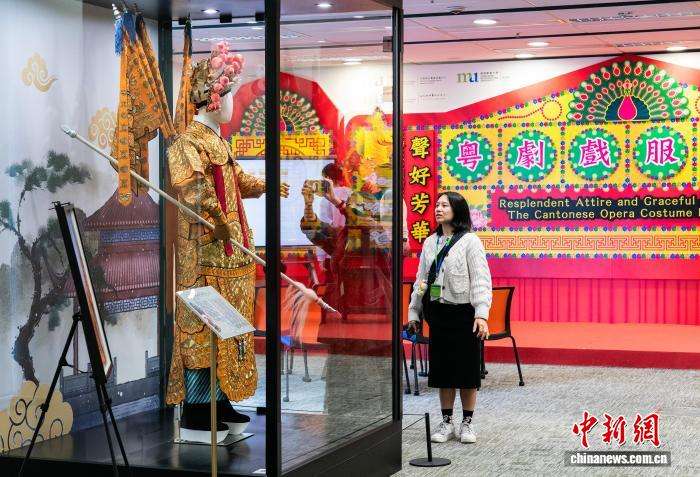 图为观众欣赏龙贯天演出时穿着过的戏服展品。(图片来源:中新社)