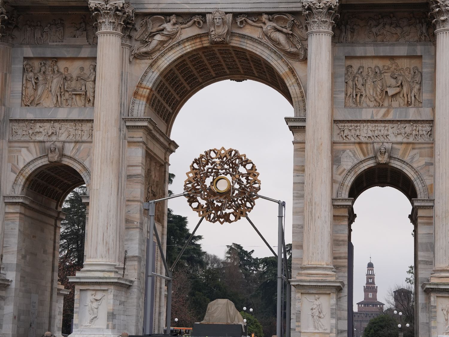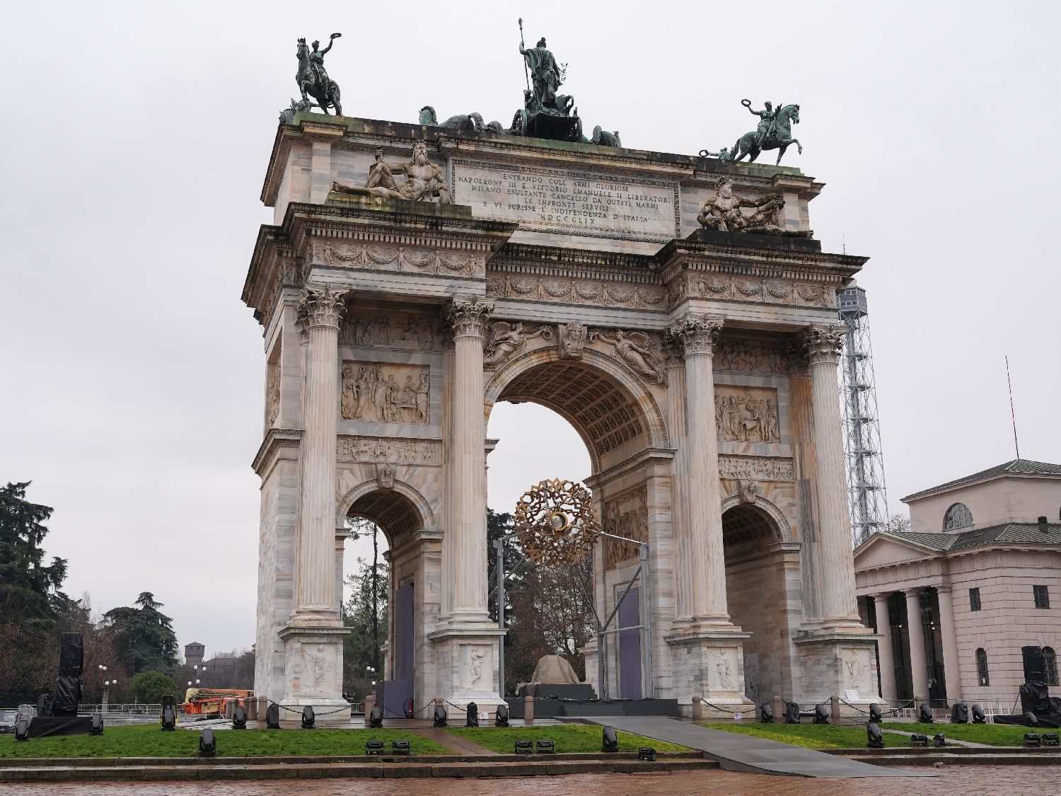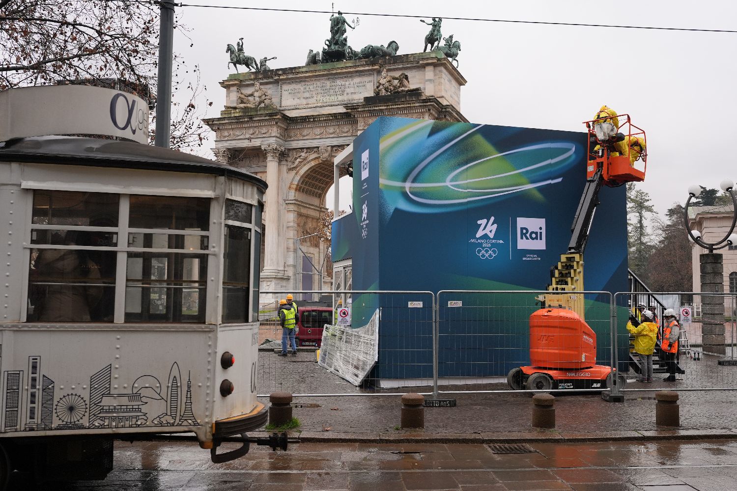 2026年米兰-科尔蒂纳冬奥会奥运圣火将在意大利米兰与科尔蒂纳两座城市同步点燃与熄灭。组委会在米兰的和平拱门与科尔蒂纳丹佩佐的迪博纳广场两处设置主火炬台。图为2月3日,意大利米兰的和平拱门和主火炬台。(图片来源:本文图片均来自中新社)