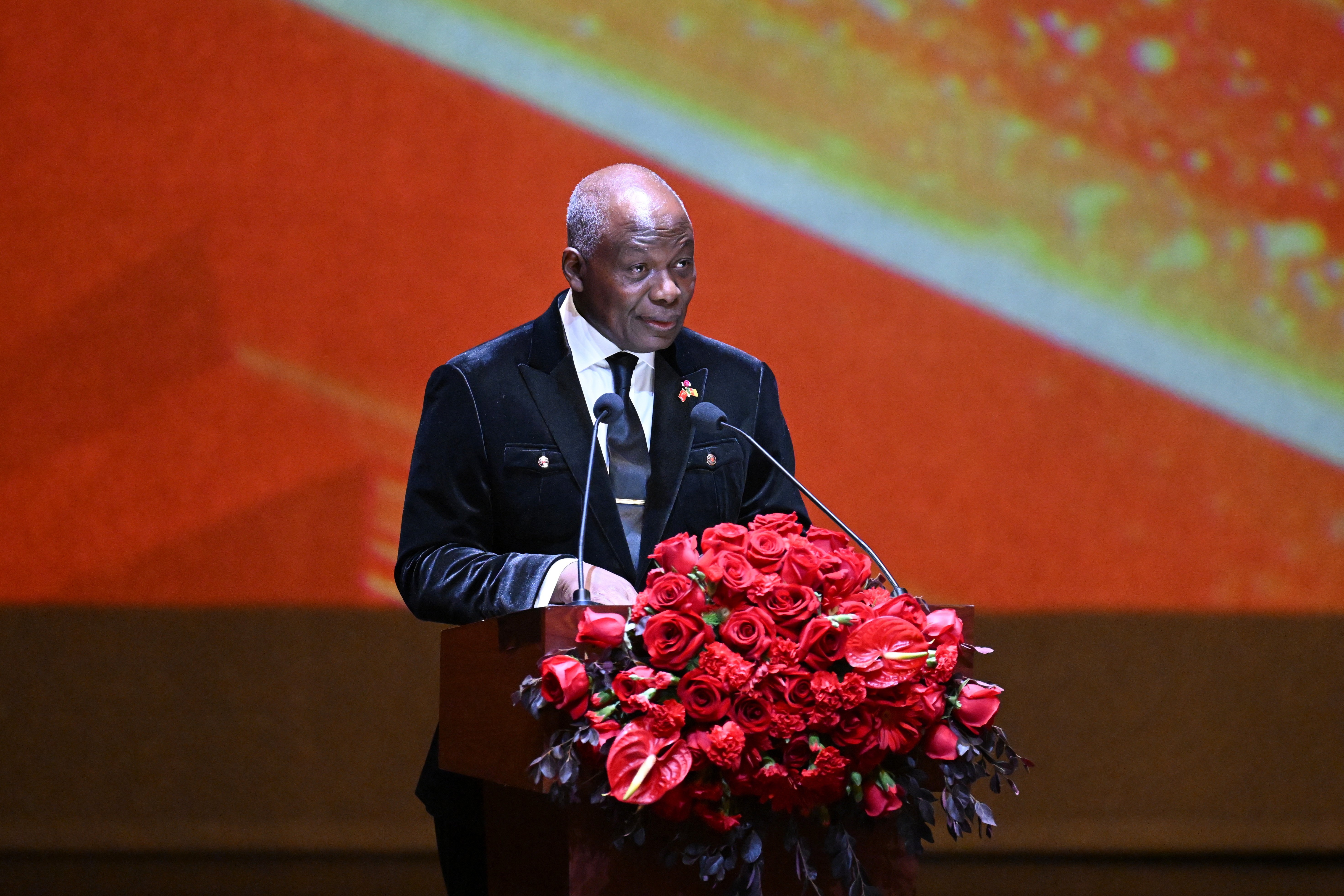 图为外国驻华使团长、喀麦隆大使姆巴纳代表各国使团祝愿中国人民新春快乐。