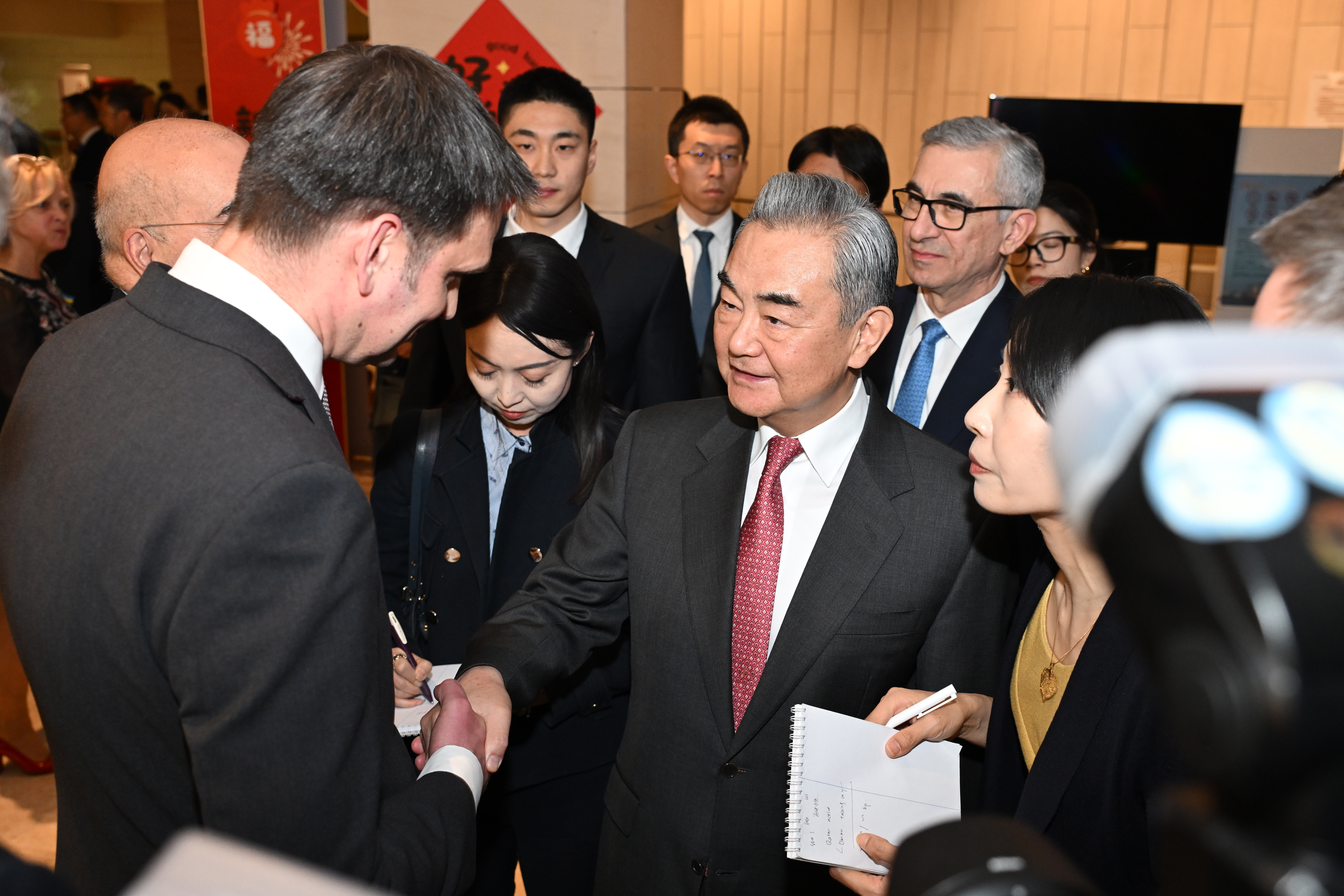 2月5日,中国外交部在北京举行2026年新年招待会。各国驻华使节和国际组织驻华代表夫妇、中方各部门代表近500人出席。图为中共中央政治局委员、外交部长王毅在招待会上与驻华使节交谈。中新社记者田雨昊摄<br/>