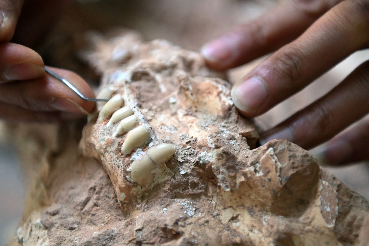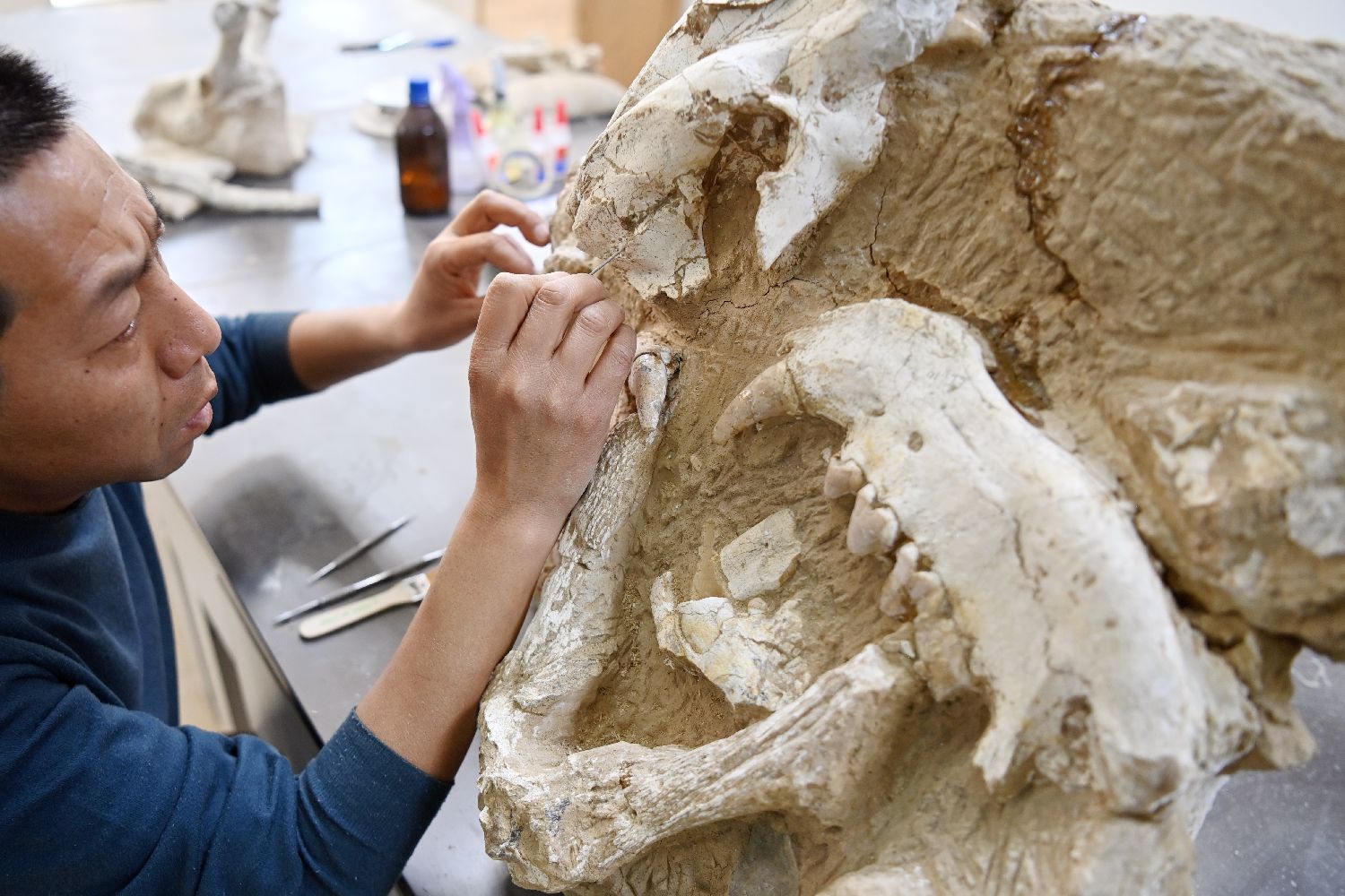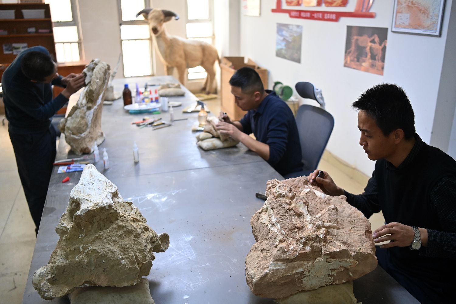 2月10日,在中国甘肃临夏州和政县古动物化石博物馆内,古生物化石修复师对化石进行修复。和政县地处青藏高原与黄土高原交汇地带,是全球晚新生代哺乳动物化石的宝库。和政县古动物化石博物馆馆藏各类化石标本3万多件,这些化石记录了古动物演变过程。2023年,中国科学院古脊椎动物与古人类研究所、和政古动物化石博物馆共同发布了和政地区新生代化石十项“世界之最”,如世界上最大陆生哺乳动物巨犀的聚集地、最丰富的铲齿象化石、最大的三趾马动物群、独一无二的和政羊等。(图片来源:本文图片均来自中新社)