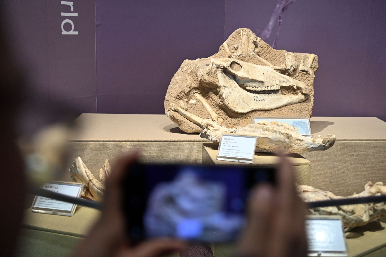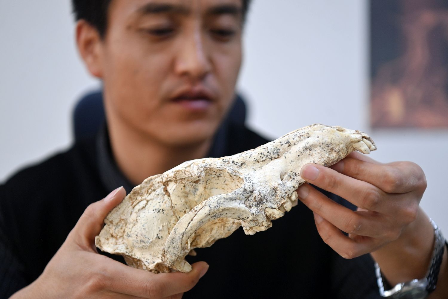 2月10日,在甘肃临夏州和政县古动物化石博物馆内,古生物化石修复师展示已修复的古动物头骨。