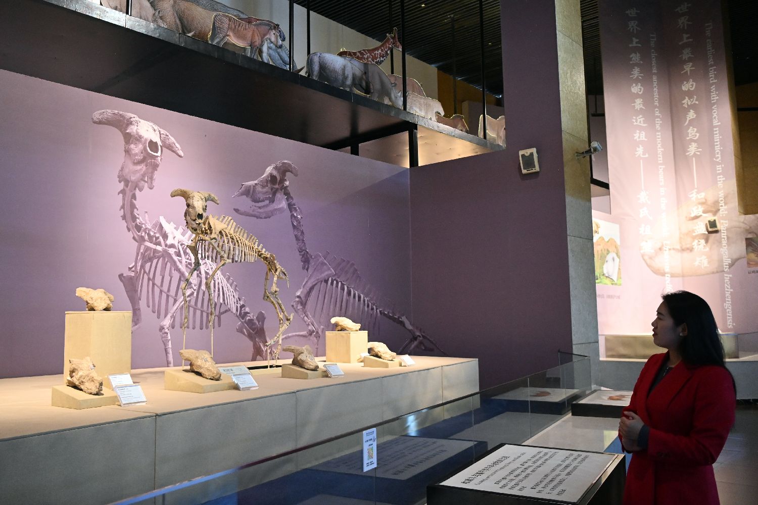2月10日,在甘肃临夏州和政县古动物化石博物馆内,工作人员对和政羊化石进行讲解。