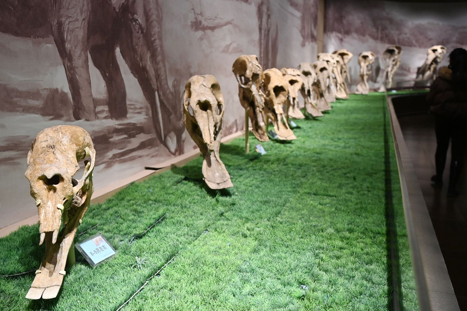 2月10日,在甘肃临夏州和政县古动物化石博物馆内展出的铲齿象从三四个月到四十多岁不同年龄段,头骨化石的大小特征。