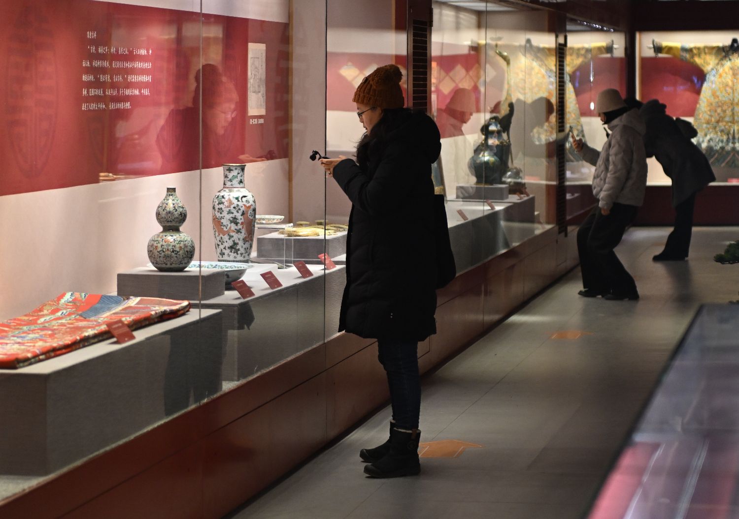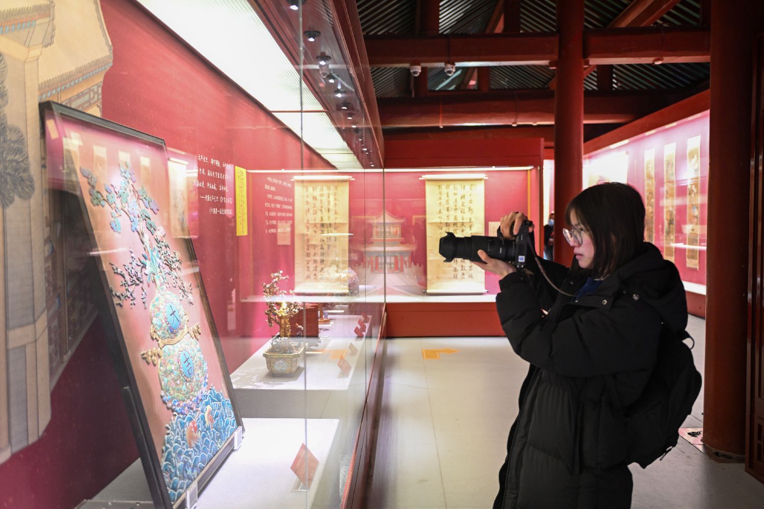 2月12日,“丹宸国色——沈阳故宫博物院建院百年新春特展”正式开展。文物中的“红”与新春的“暖”相融相契,传递辞旧迎新的真挚祝福。图为观众在观看展览。(图片来源:本文图片均来自中新社)