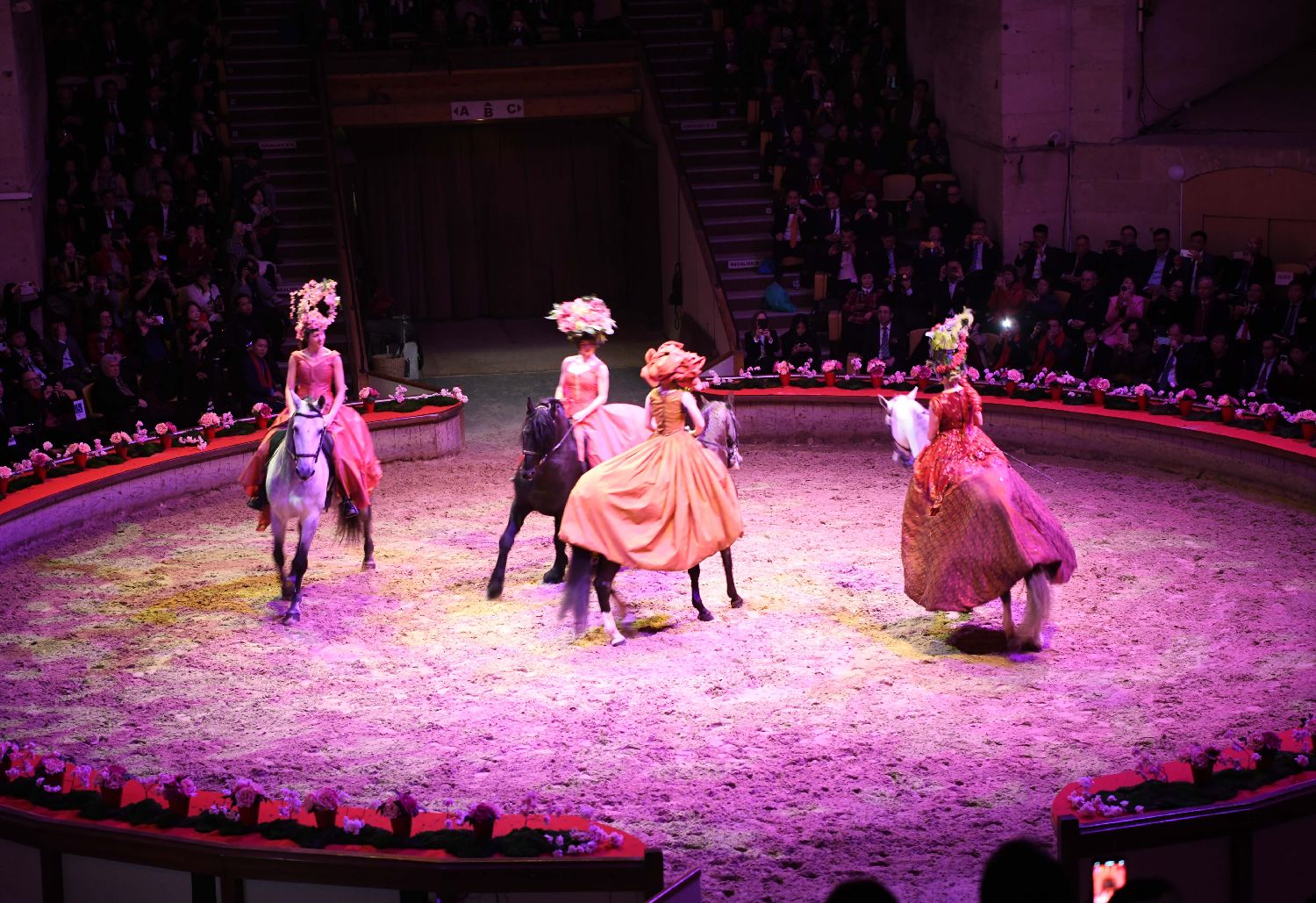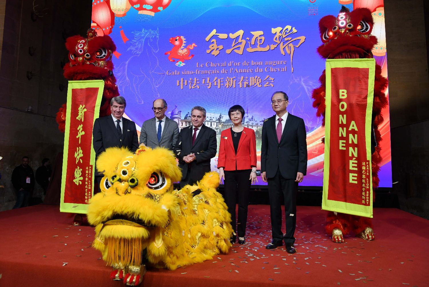 2月11日晚,“金马迎瑞”中法马年新春晚会在法国北部城市尚蒂伊举行。图为中国驻法国大使邓励(右一)及夫人张华(右二)、上法兰西大区议会主席贝特朗(中)等嘉宾合影。(图片来源:本文图片均来自中新社)
