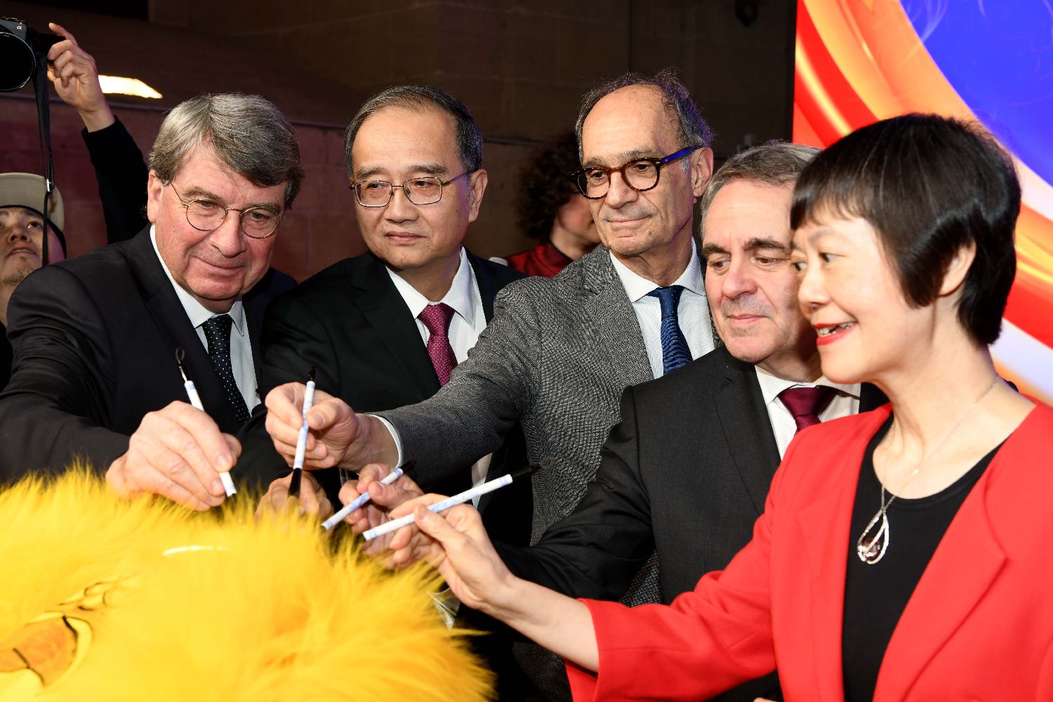 图为中国驻法国大使邓励(左二)及夫人张华(右一)、上法兰西大区议会主席贝特朗(右二)等嘉宾为醒狮点睛。