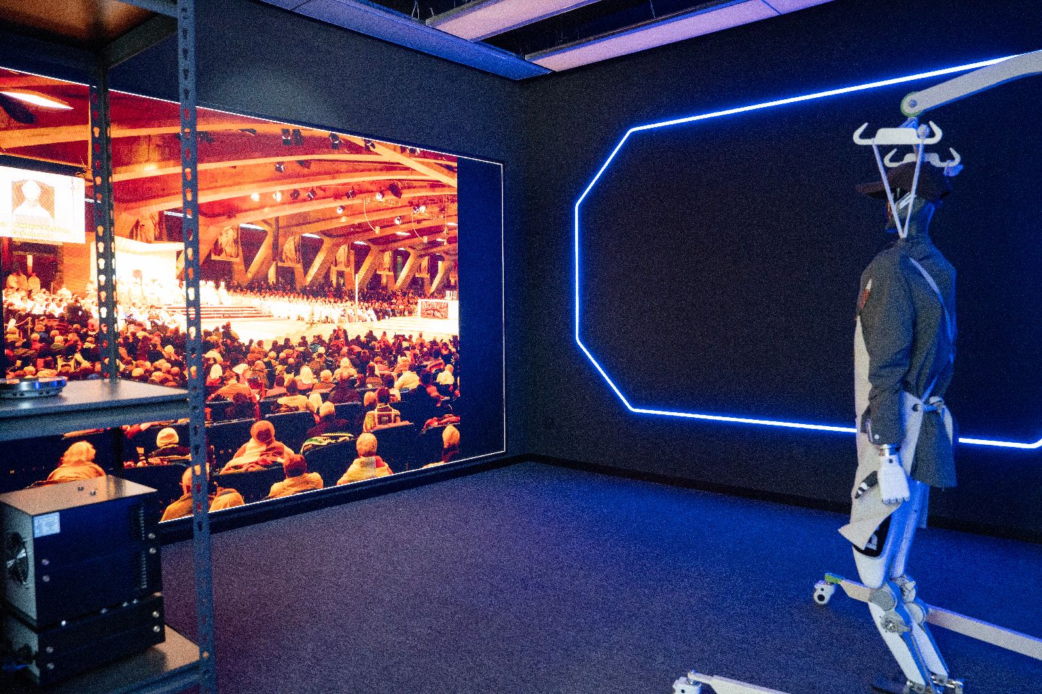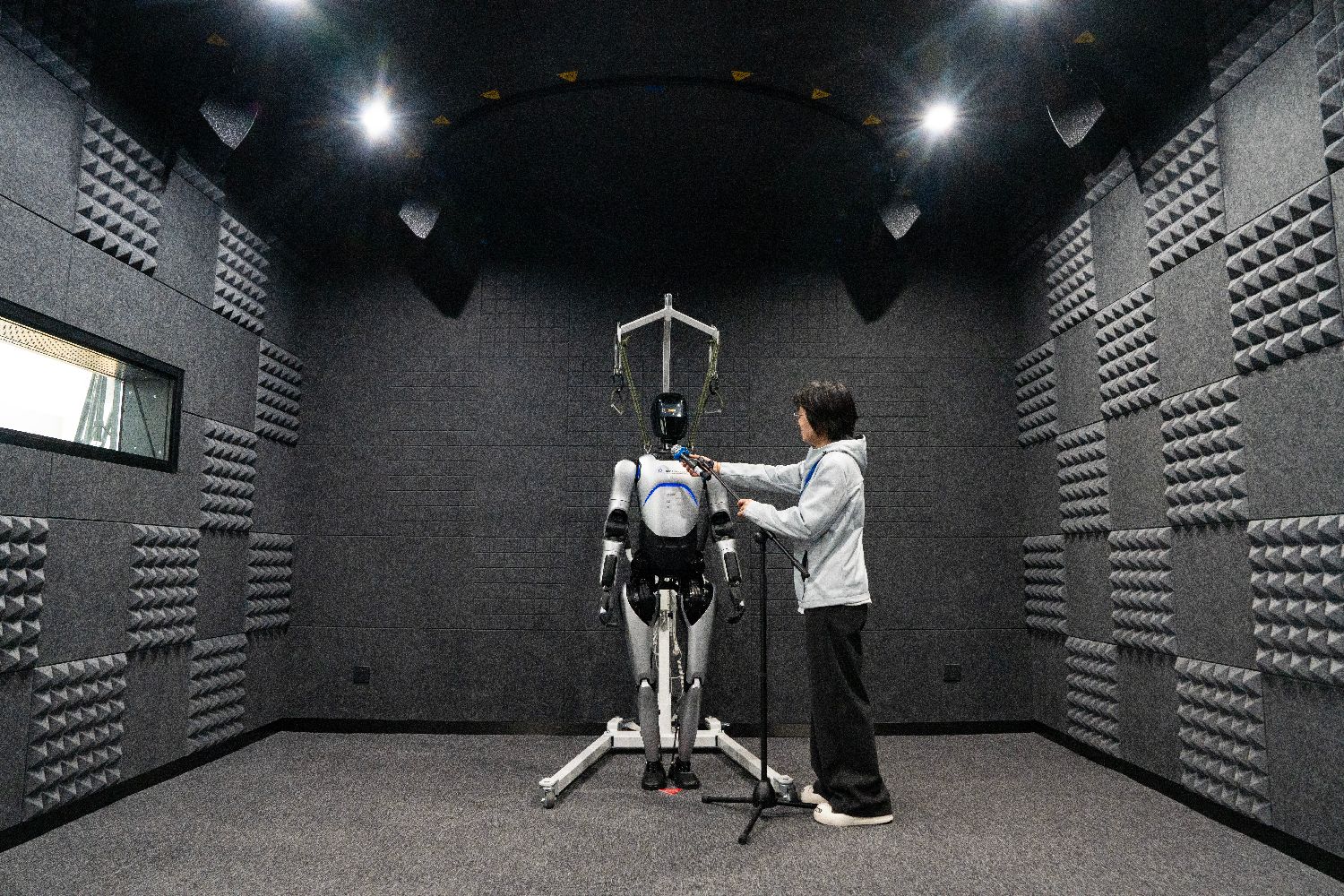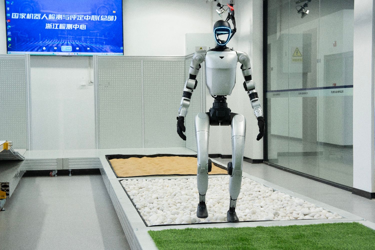 图为人形机器人在不同“路况”上进行MTBF(平均无故障间隔时间)的检测。