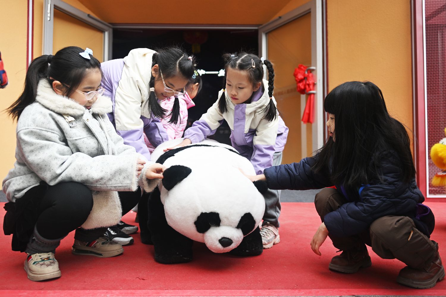 2月23日,扮成熊猫的四足机器人与游客互动。