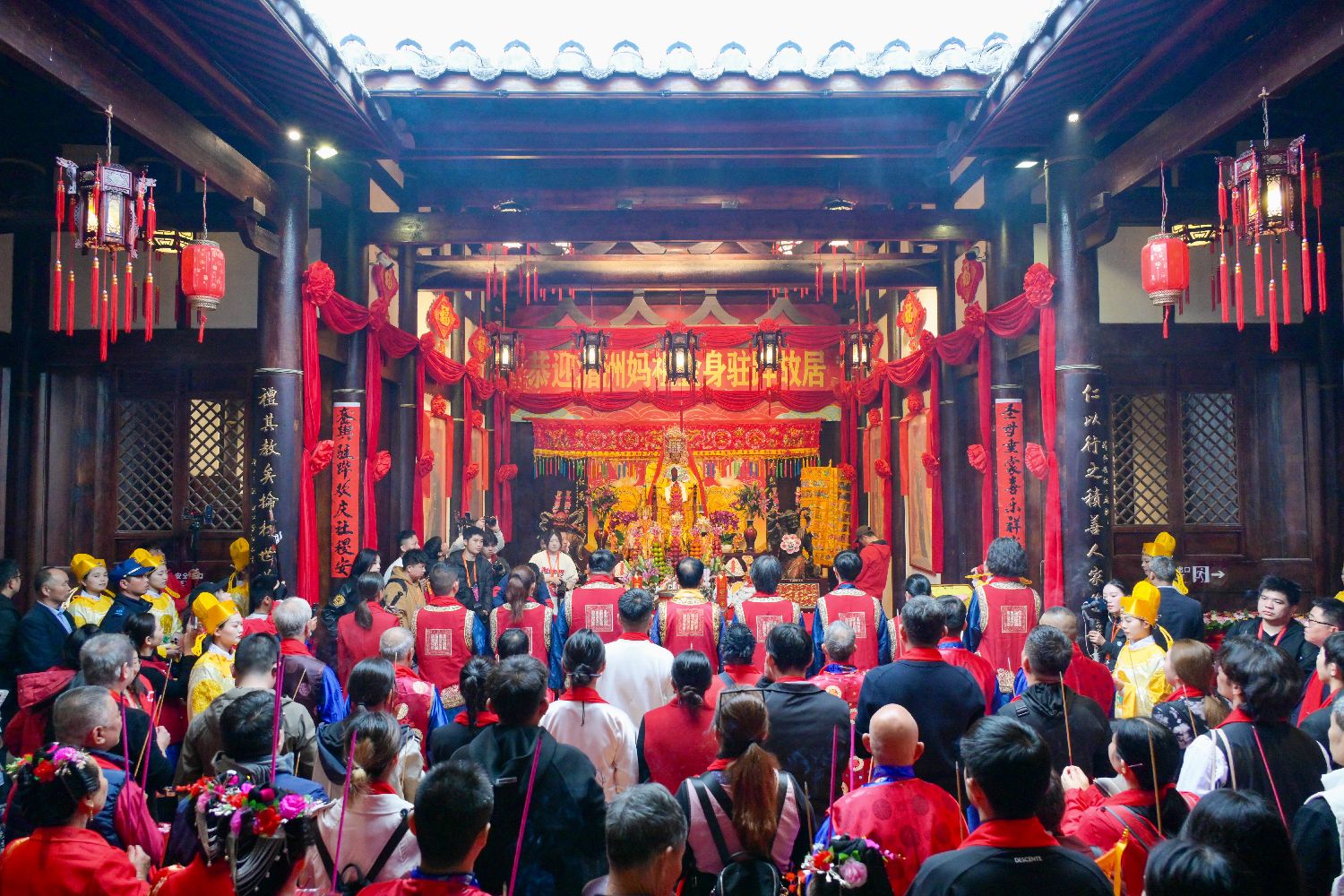 2月24日,“妈祖赐福,欢庆元宵”——莆台同胞护驾妈祖金身回上林故居省亲布福活动在福建省莆田市湄洲岛启幕。两岸妈祖敬仰者齐聚妈祖故里,同谒妈祖、共祈平安。图为妈祖金身抵达上林故居。(图片来源:本文图片均来自中新社)