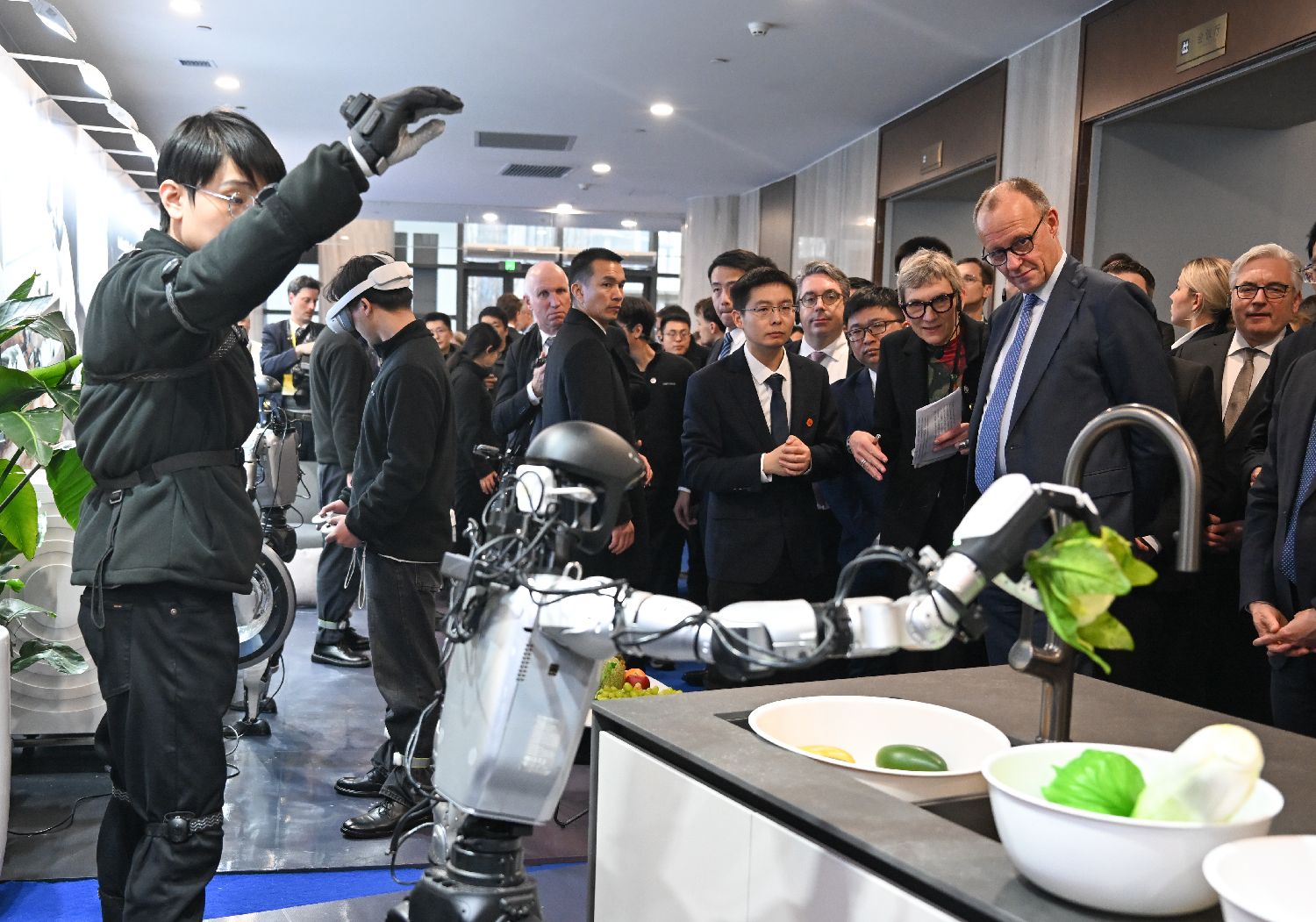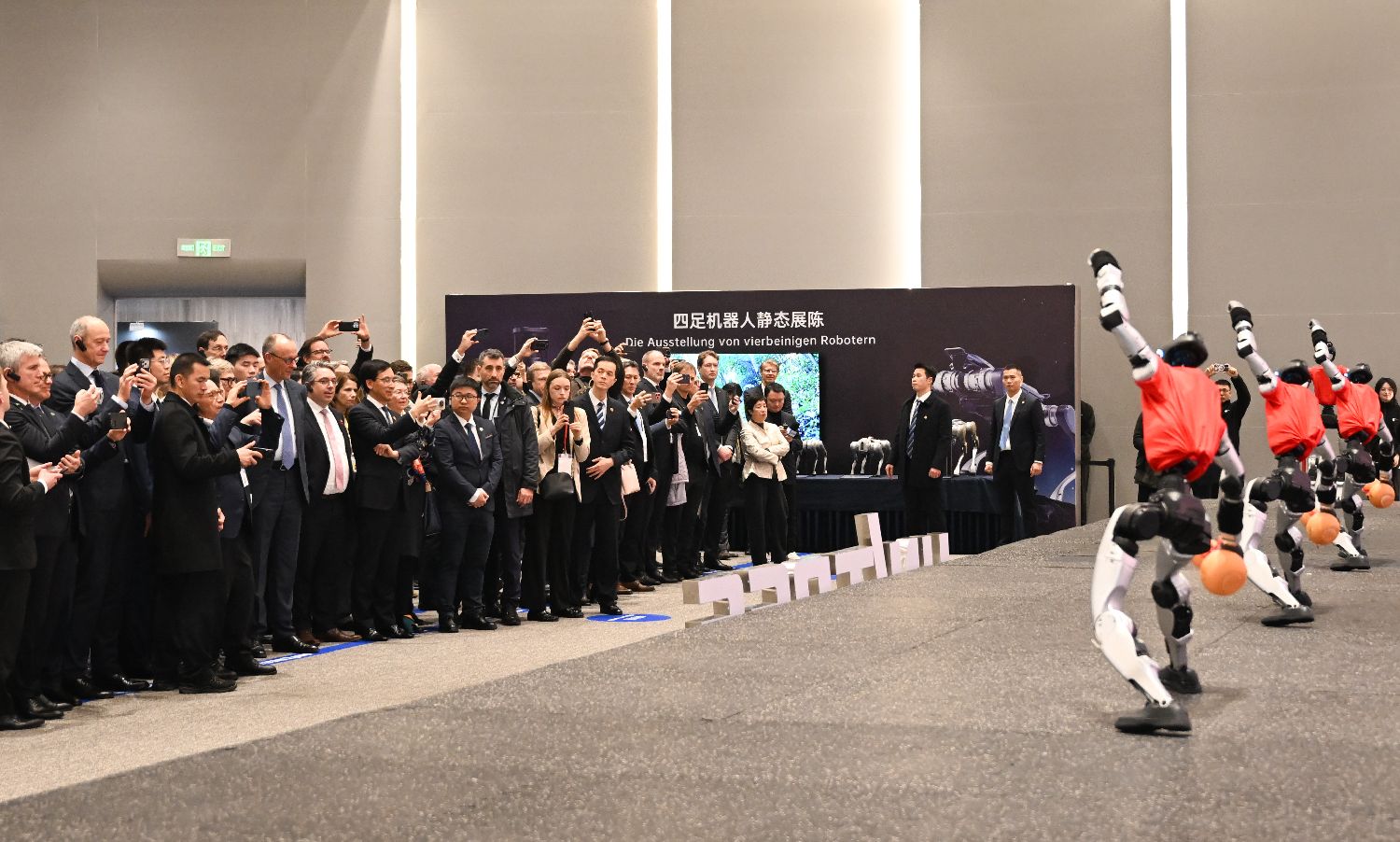 2月26日,德国总理默茨观看人形机器人表演节目。当日,德国总理默茨率近30位德国经济界代表组成的高级别代表团,在浙江杭州参访中国机器人企业宇树科技。(图片来源:本文图片均来自中新社)