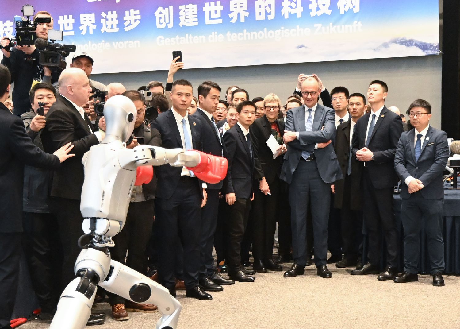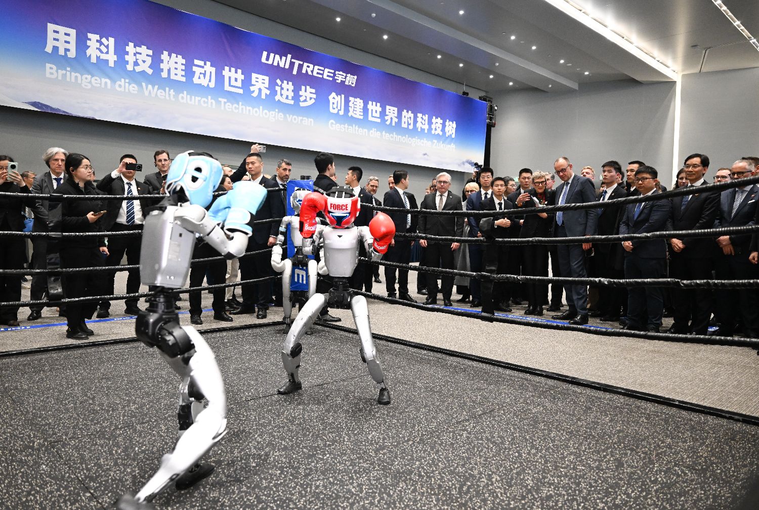 2月26日,德国总理默茨观看机器人拳击表演。