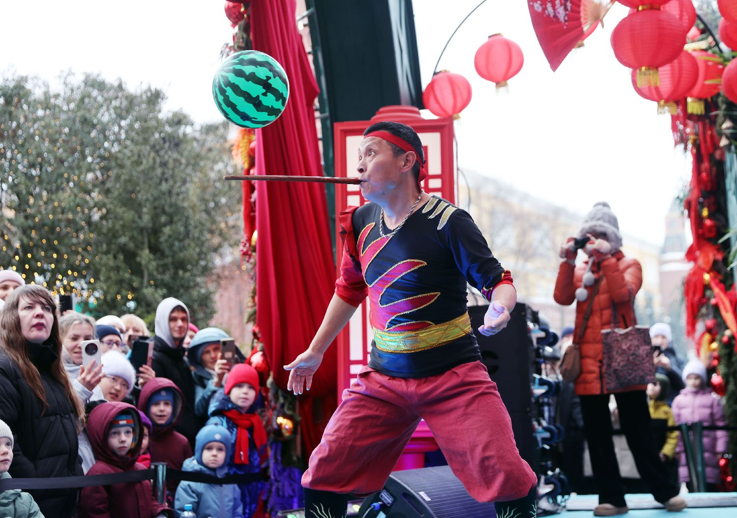3月1日,俄罗斯首都莫斯科,中国浙江省非物质文化遗产展演团在马涅什广场演出。图为演员表演手狮舞。2月16日至3月1日,莫斯科举办“欢乐春节”系列庆祝活动。(图片来源:本文图片均来自中新社)