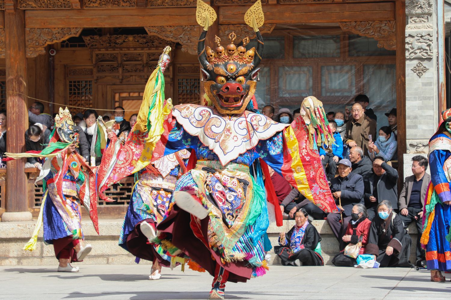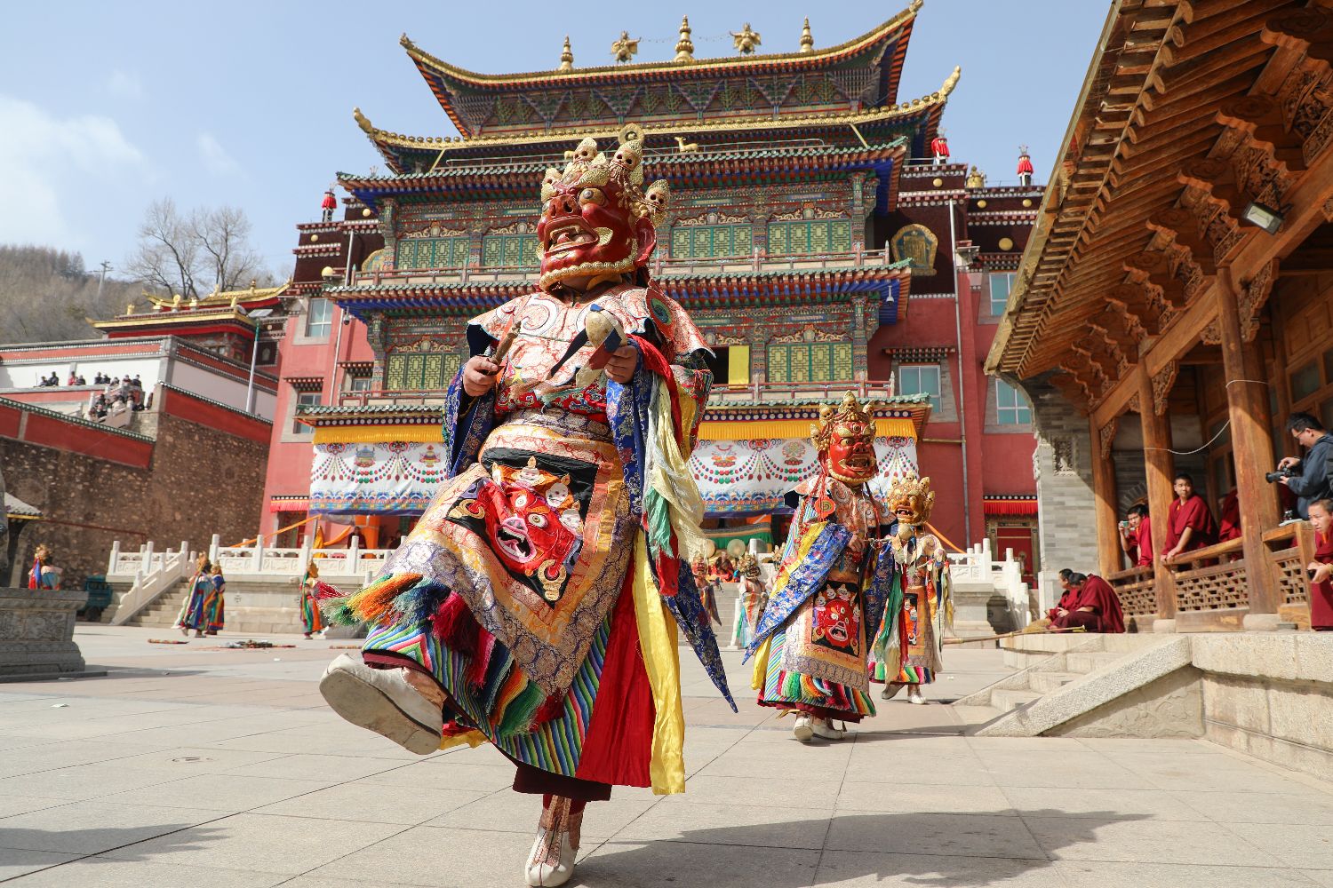 图为僧人佩戴面具表演。