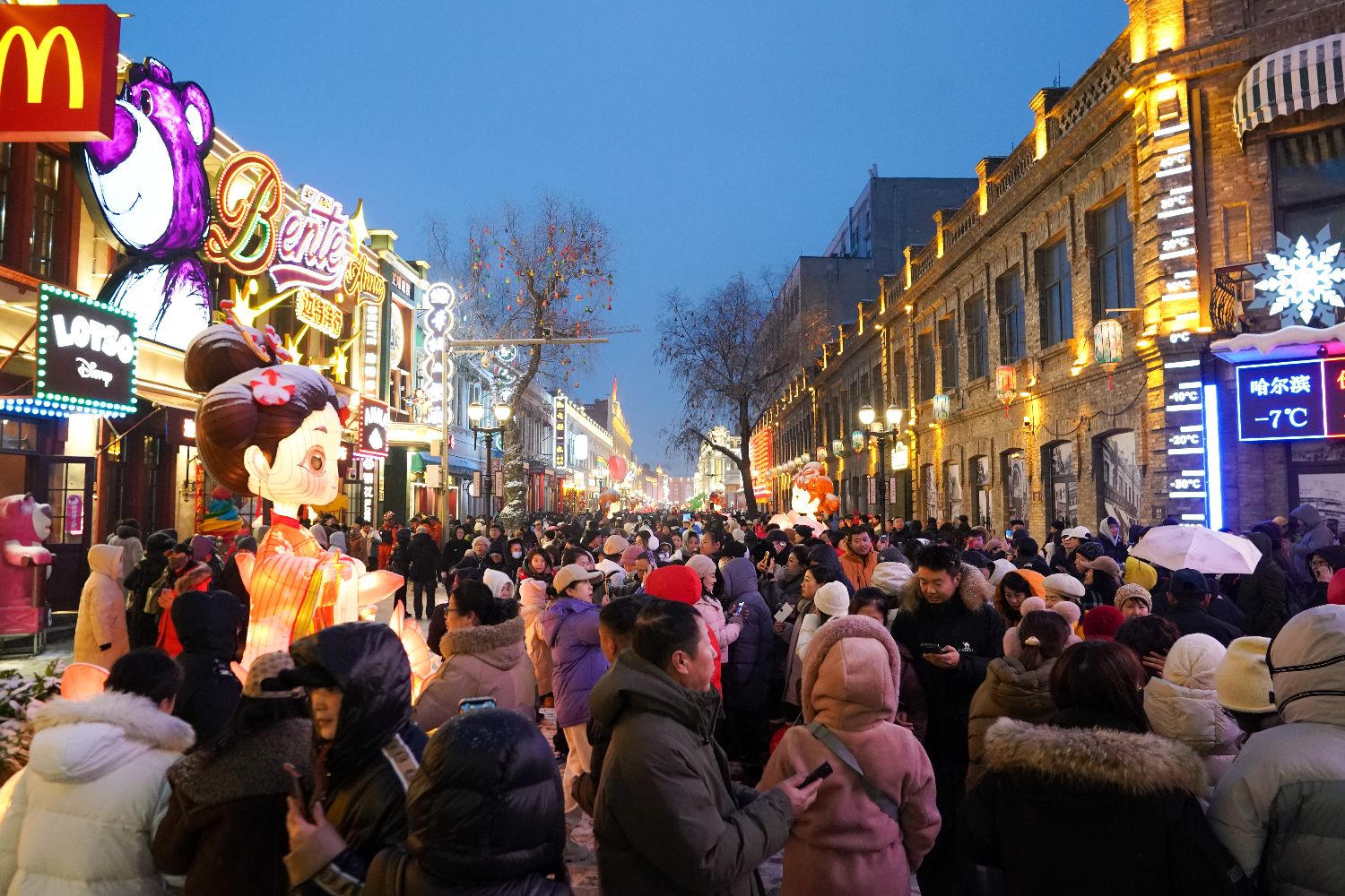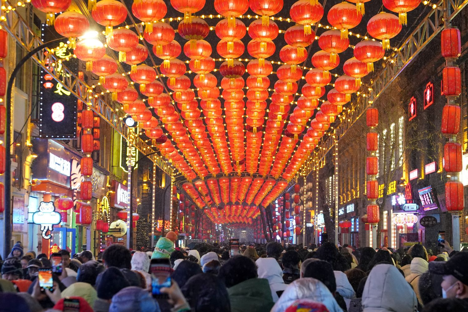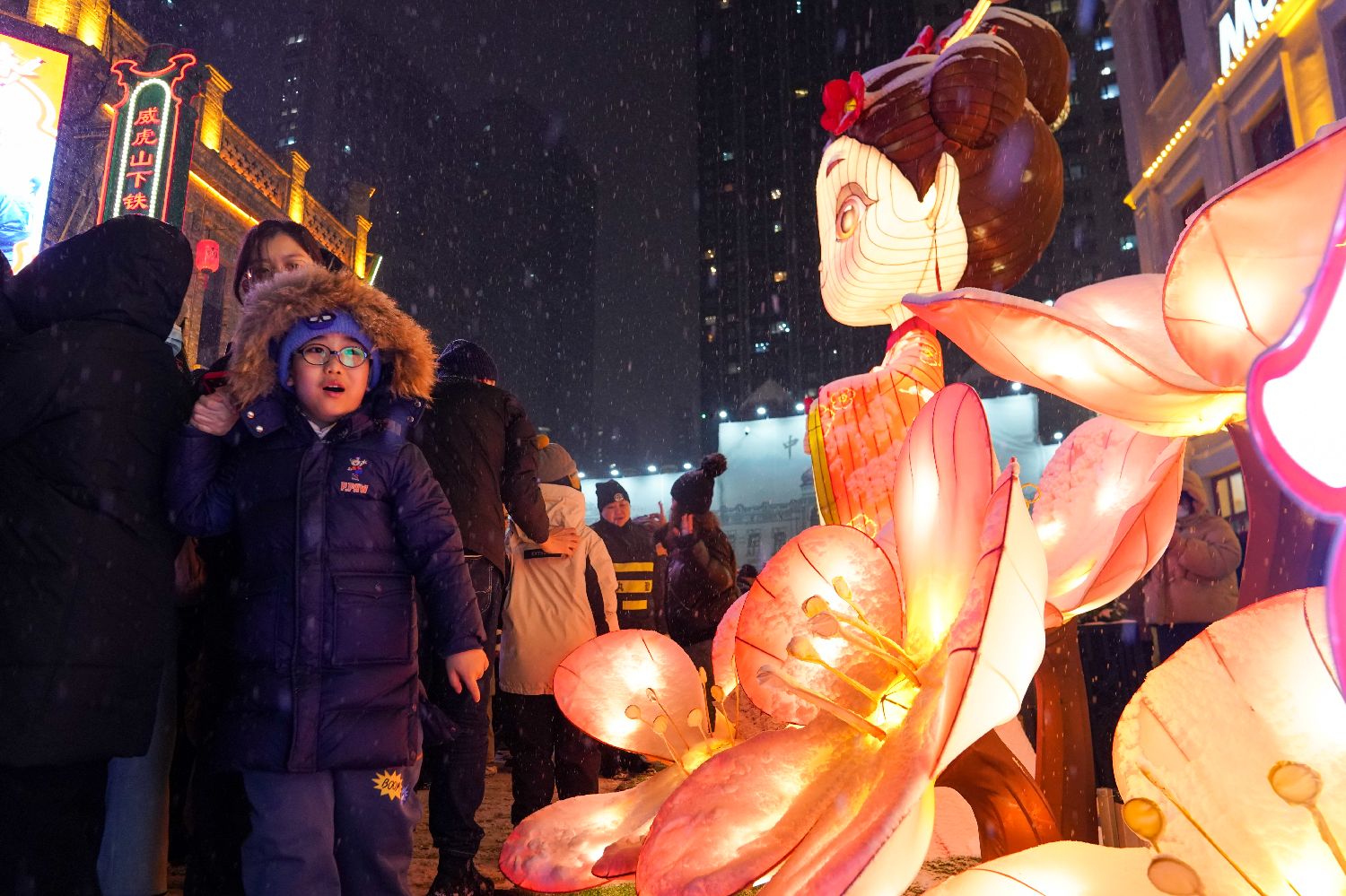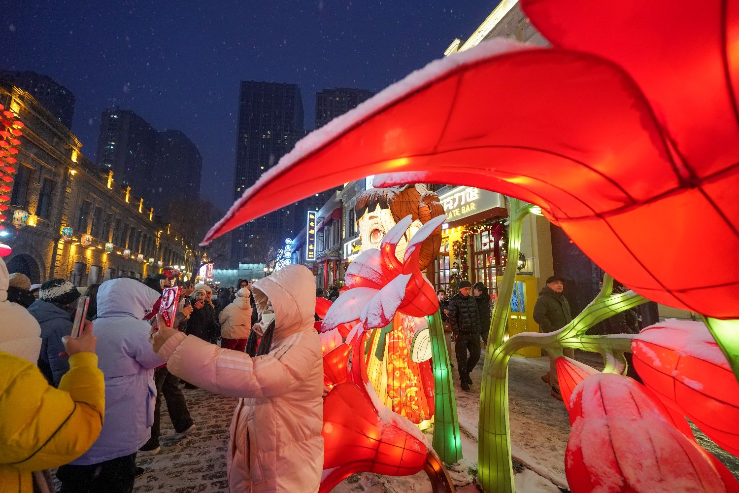 3月3日,农历正月十五元宵节,位于黑龙江省哈尔滨市的中华巴洛克街区举办“福满巴洛克”元宵灯会。活动现场设置十二花神花灯群、大型福字组灯,当日恰好迎来降雪天气,雪花落在花灯上,游客在此尽享“雪打灯”的浪漫。图为游客赏福字组灯。(图片来源:本文图片均来自中新社)