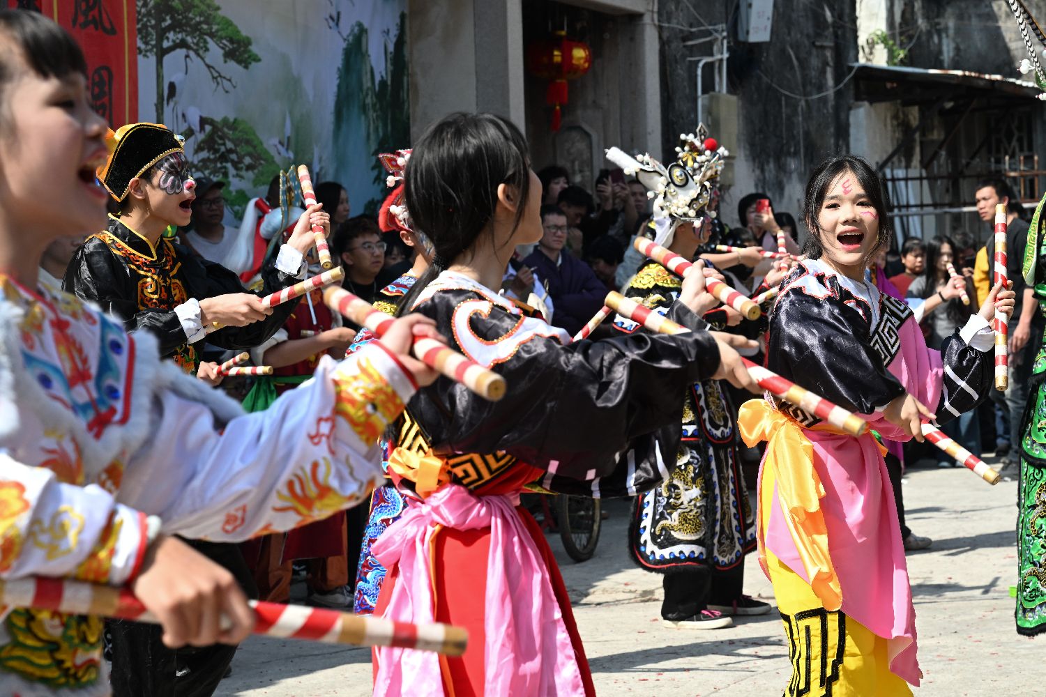 3月8日,大寨仙圃青年英歌队在广东省潮州市金石镇辜厝村表演,展现英歌舞的魅力和风采。图为活动现场。(图片来源:中新社)