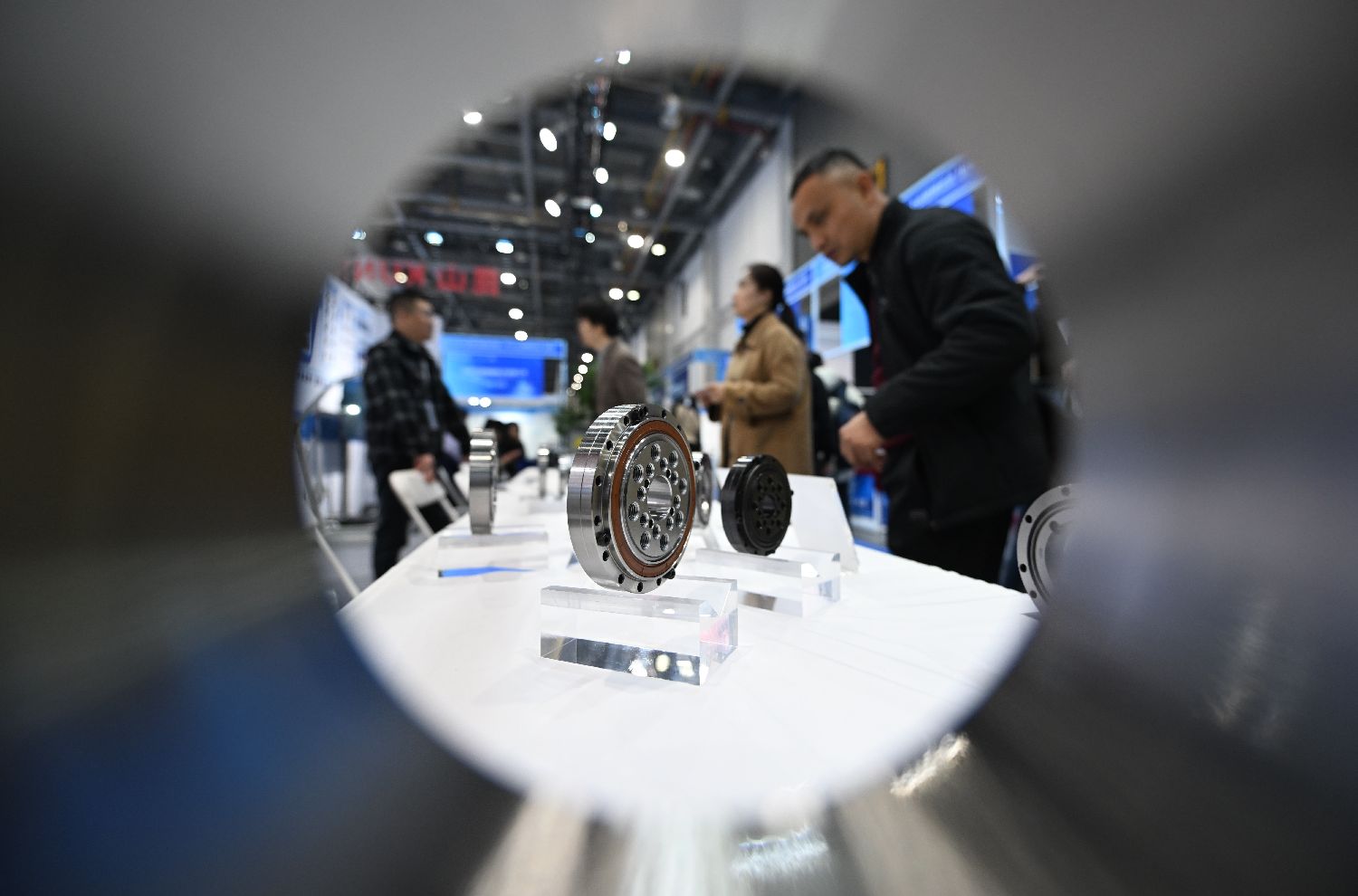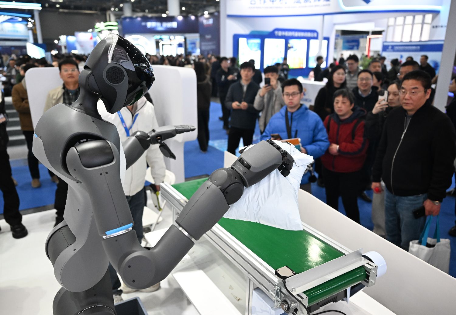 3月11日,第三届中国具身智能机器人产业大会暨展览会在浙江杭州举行,各种类型的人形机器人及零部件集中展示。图为产业人形机器人吸引参观者。(图片来源:本文图片均来自中新社)