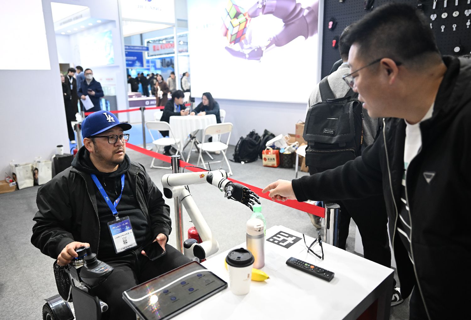 图为工作人员展示搭载机械臂灵巧手、用于养老助残领域的智能轮椅。