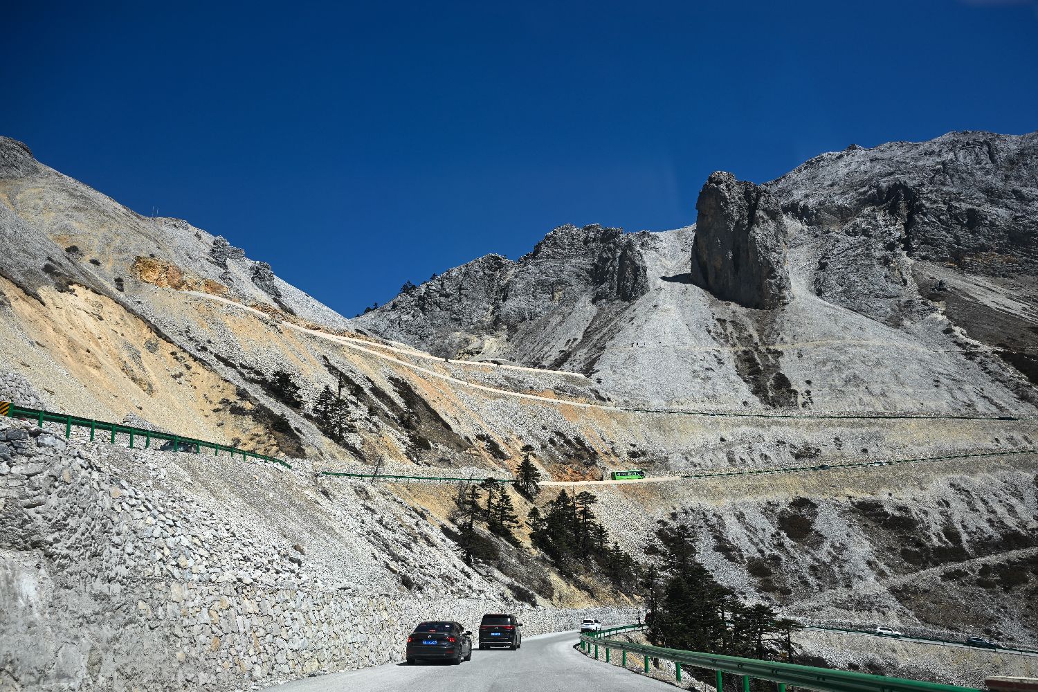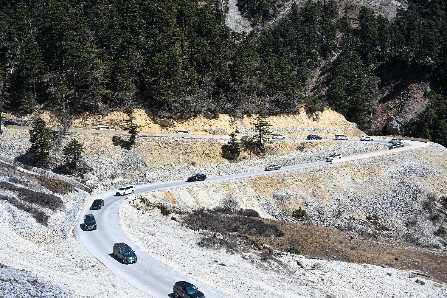 3月11日,位于云南省迪庆藏族自治州香格里拉市的巴拉格宗景区开放游客自驾车辆进入景区核心区域,自驾爱好者在穿梭峡谷天路中,体验“有一种叫云南的生活”。图为当日,参与自驾的车辆穿梭在高山峡谷间。(图片来源:本文图片均来自中新社)