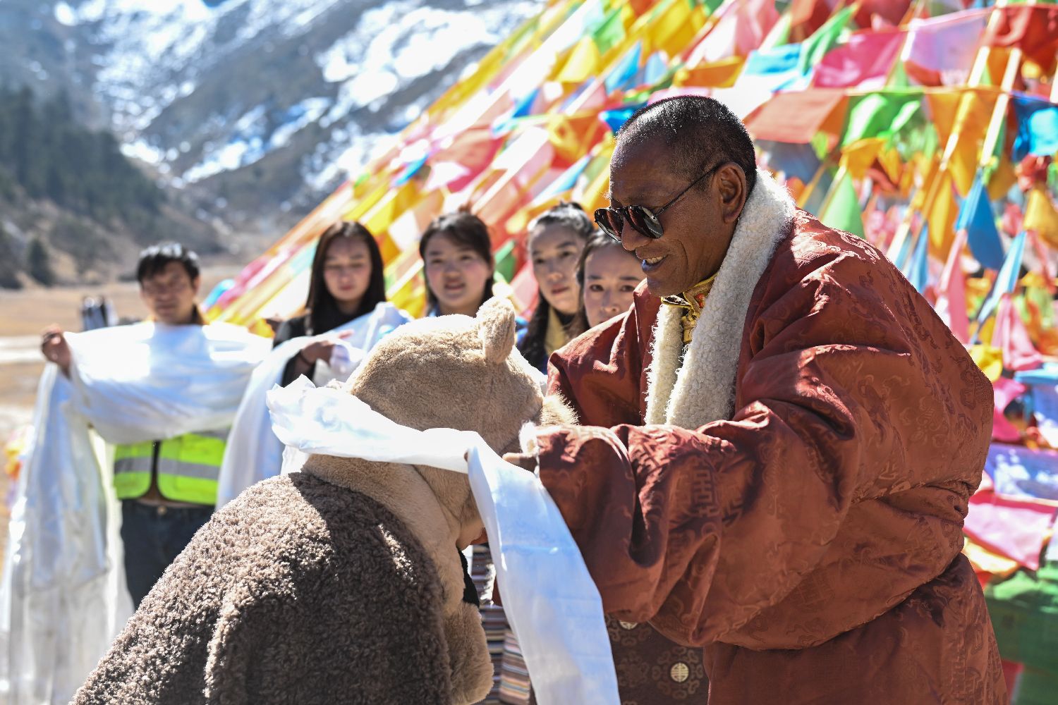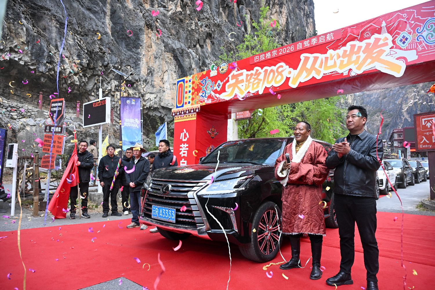3月11日,巴拉格宗景区创始人斯那定珠(左一)为首批体验自驾的游客献哈达。