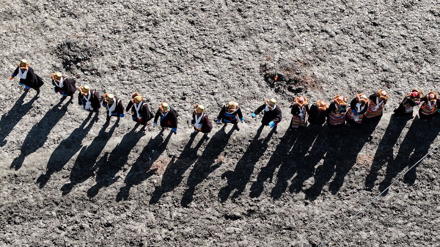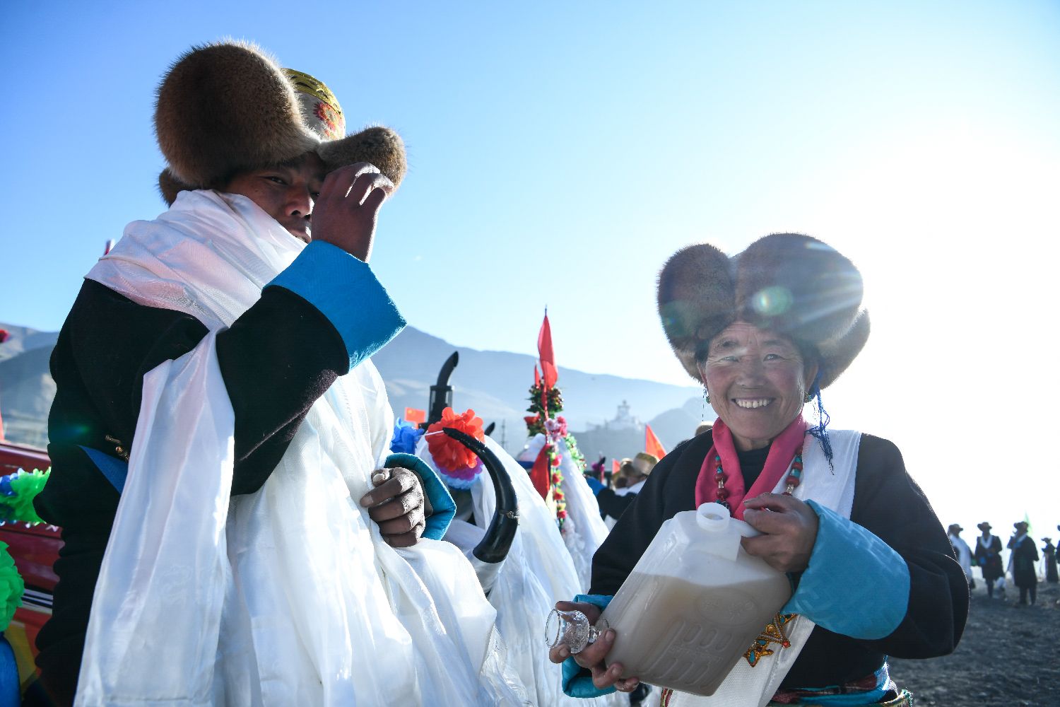 3月16日,西藏山南市乃东区门中岗社区村民身着盛装,按照传统习俗,手捧青稞酒,在雍布拉康宫殿脚下的西藏“第一块农田”举行春耕仪式,播下今春第一粒种子。图为西藏山南市乃东区门中岗社区村民在春耕仪式上互敬青稞酒。(图片来源:本文图片均来自中新社)