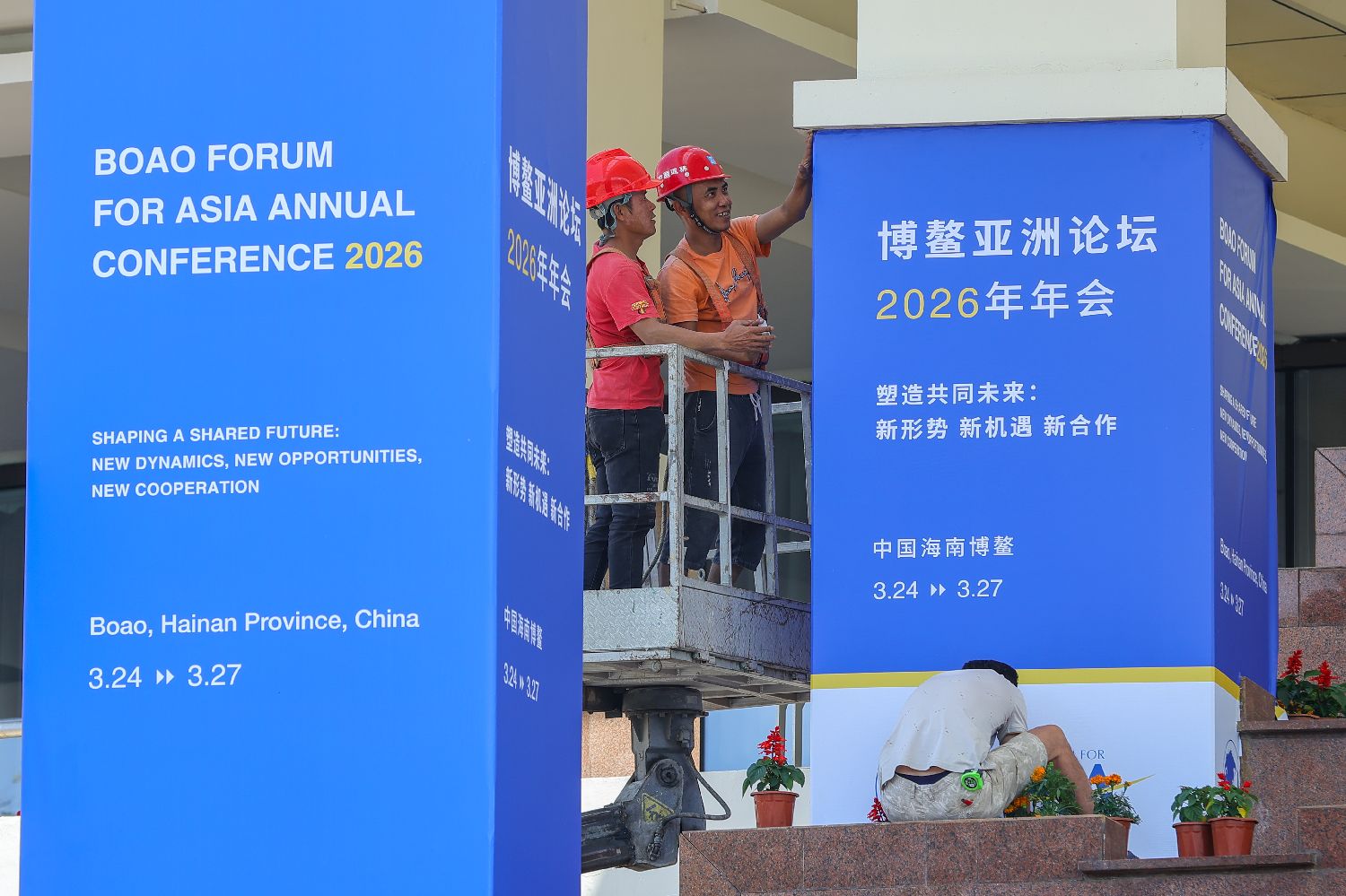 图为工作人员在博鳌亚洲论坛永久会址安装年会主题展板。