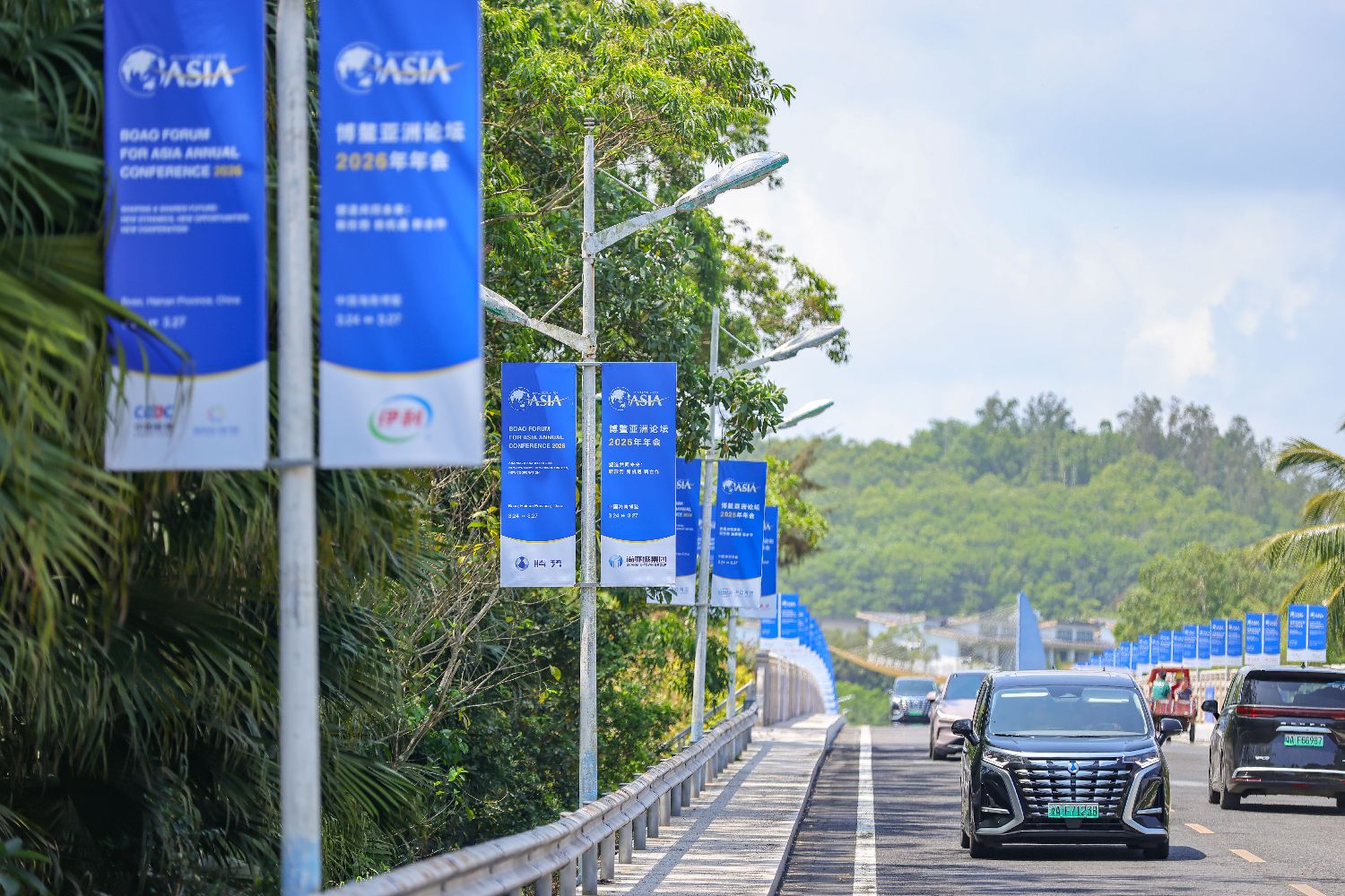 图为博鳌培兰桥道路两侧,博鳌亚洲论坛2026年年会道旗整齐排列。