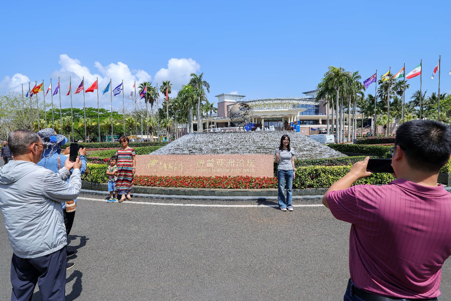 图为游客在博鳌亚洲论坛永久会址前打卡拍照。