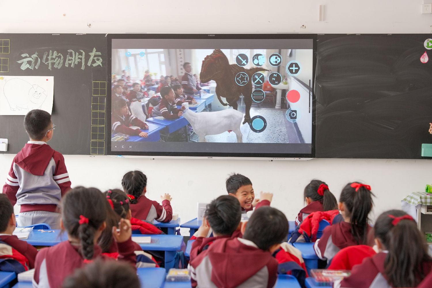 3月18日,黑龙江哈尔滨继红小学,学生在智慧美术课堂通过AR技术“近距离”观察动物形态。该校是首批中国国家级人工智能教育基地,学校将AI备课平台、课堂循证设备、智能作业批改平台、智慧体育设备等融合场景落地应用,把AI与教学深度融合,课堂教学实现“双向互动”。(图片来源:本文图片均来自中新社)